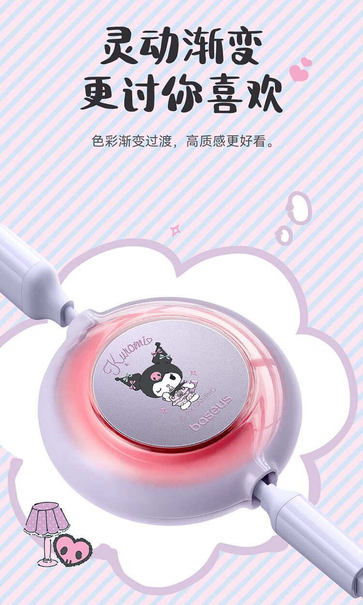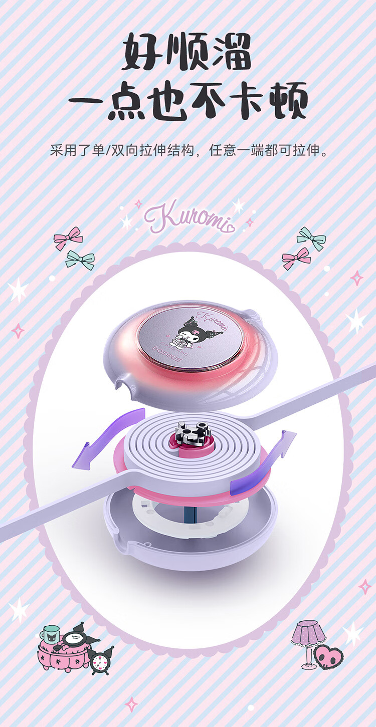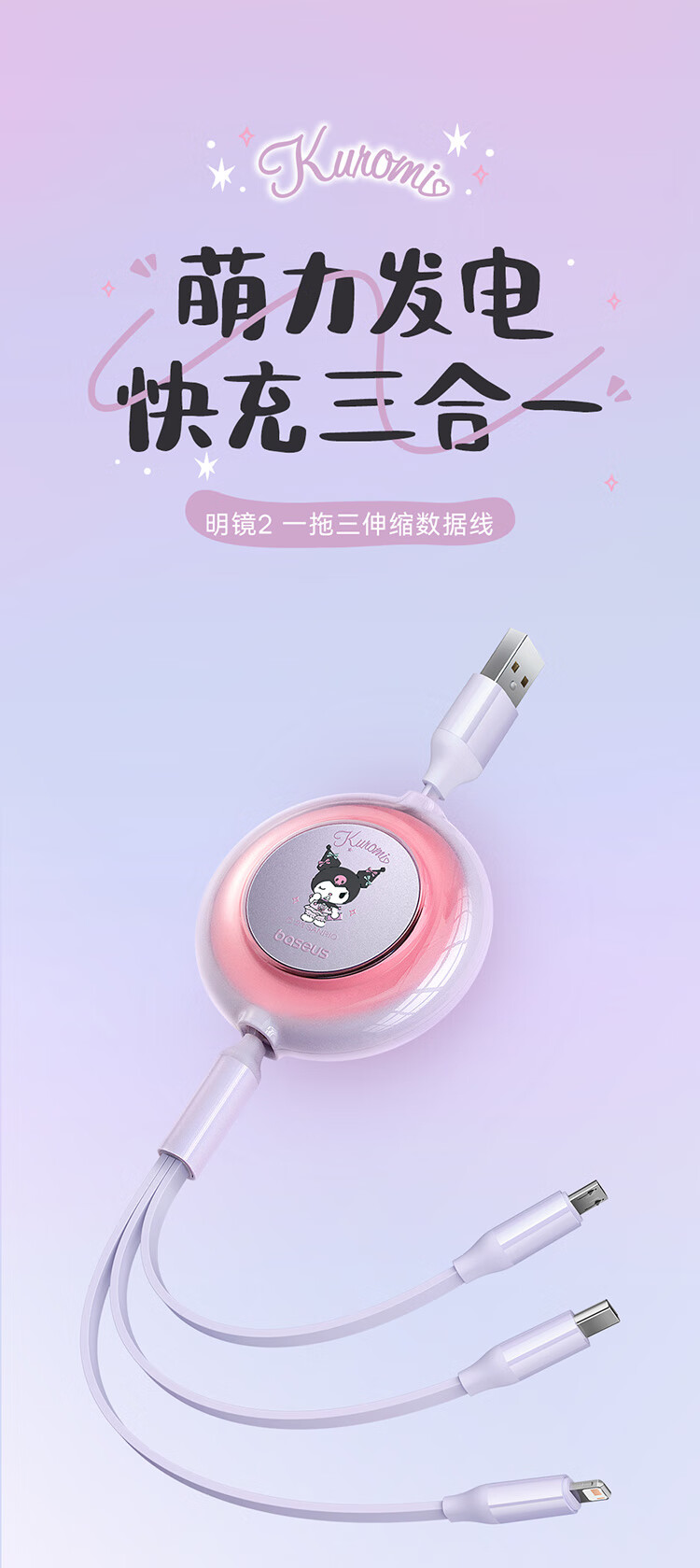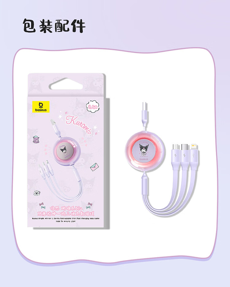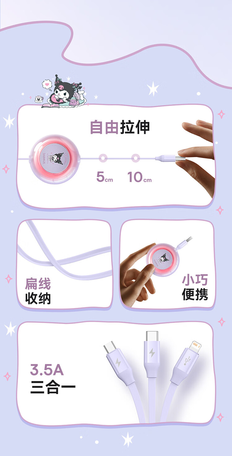 Baseus charging cable three-in-one retractable data cable one-to-three car fast charging cable suitable for Apple iPhone Huawei Type-c mobile phone tablet Sanrio genuine authorized purple