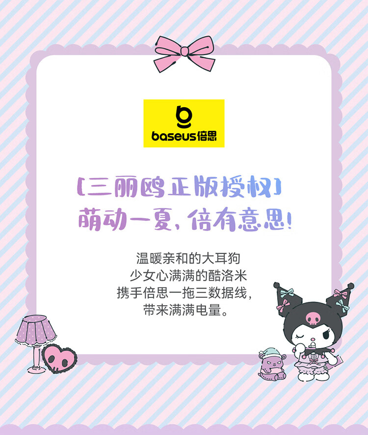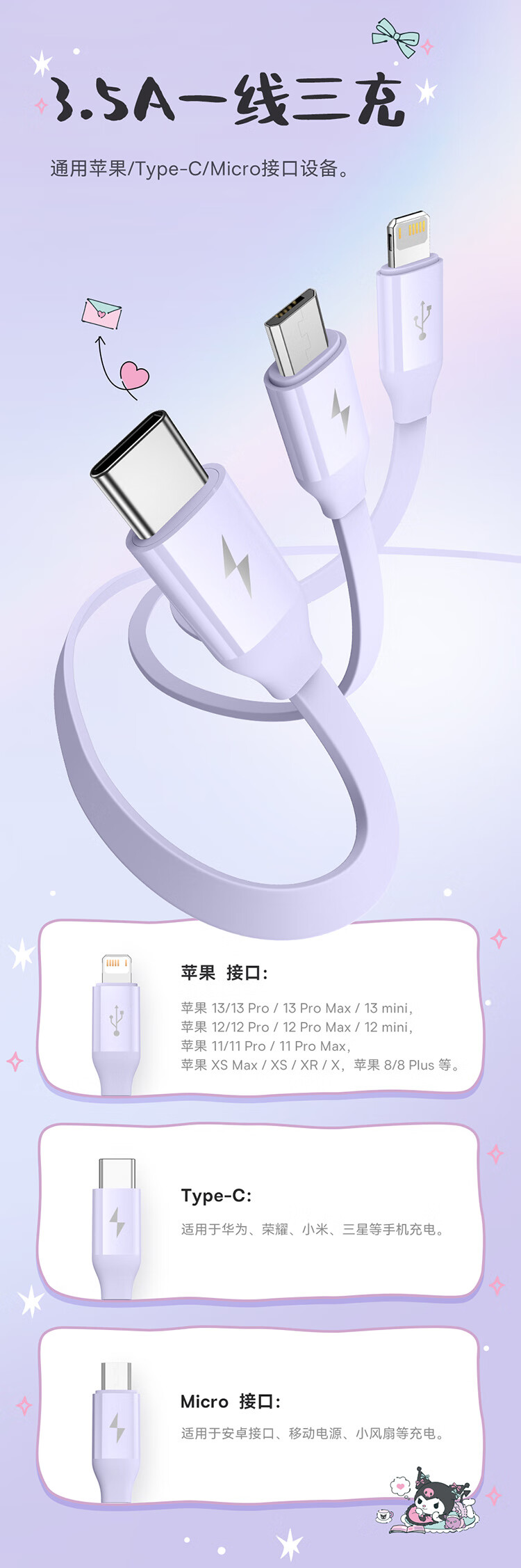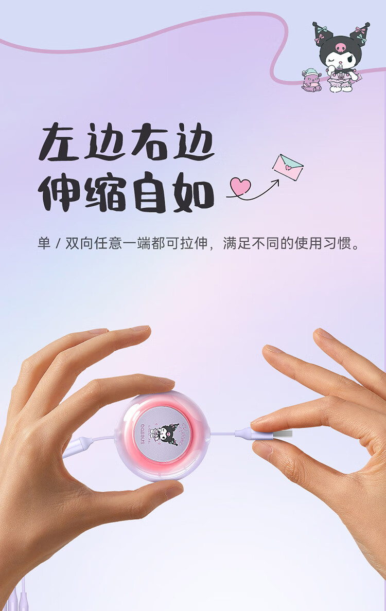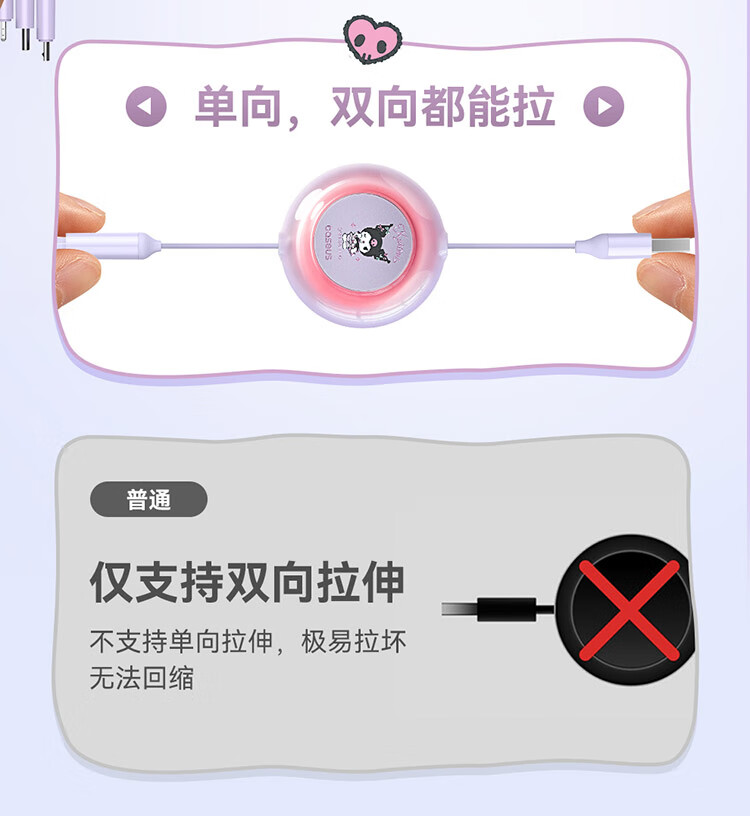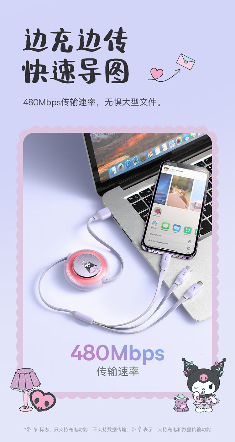 Baseus charging cable three-in-one retractable data cable one-to-three car fast charging cable suitable for Apple iPhone Huawei Type-c mobile phone tablet Sanrio genuine authorized purple