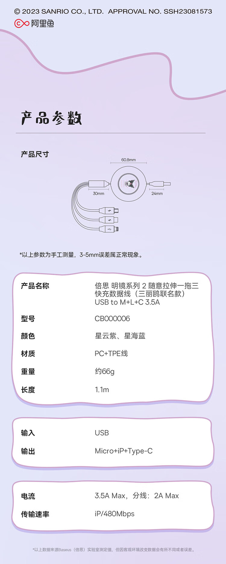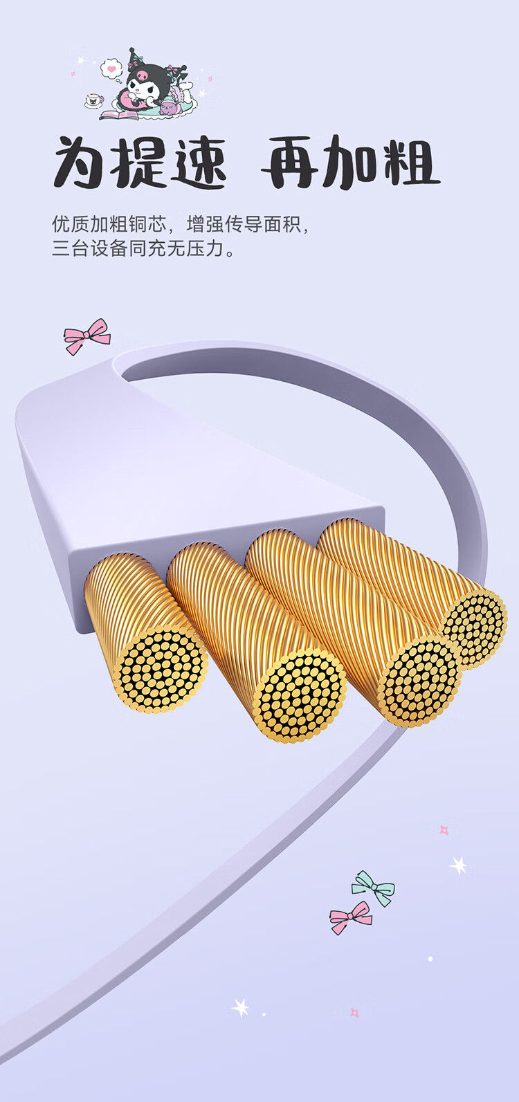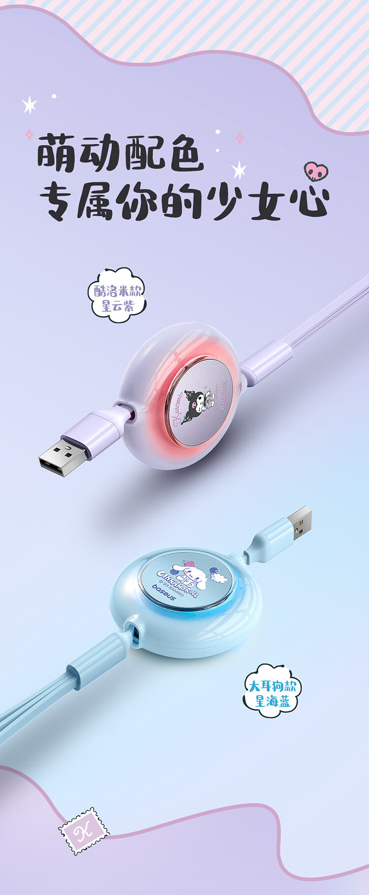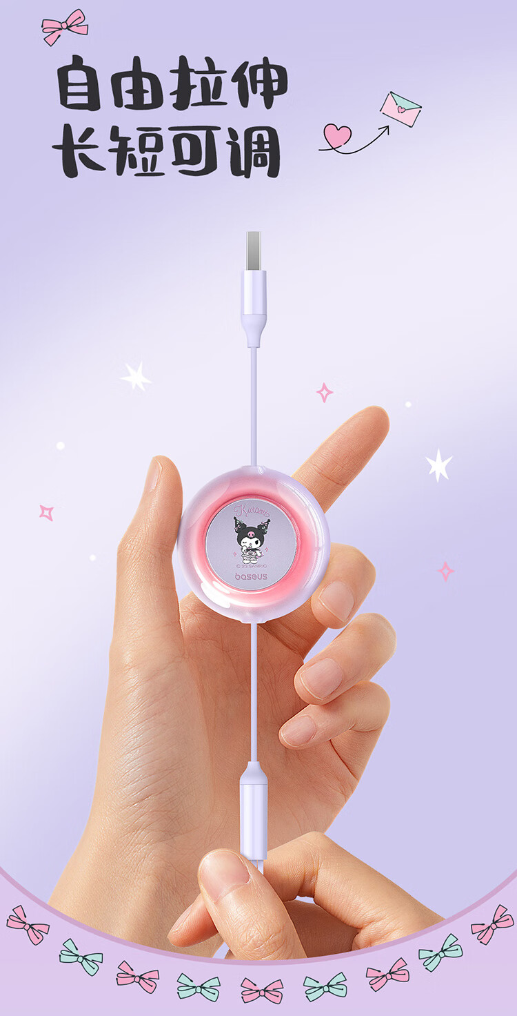 Baseus charging cable three-in-one retractable data cable one-to-three car fast charging cable suitable for Apple iPhone Huawei Type-c mobile phone tablet Sanrio genuine authorized purple