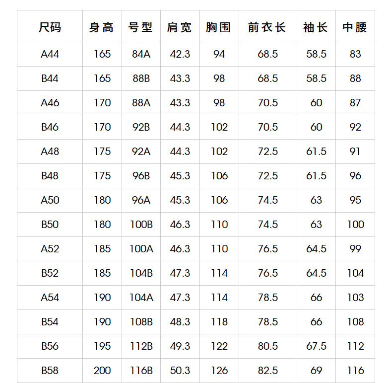 China (cm) 160-165/84-86 165-170 / 88-90 167-172 / 92-96 168-173 / 98-102 170-176 / 106-110