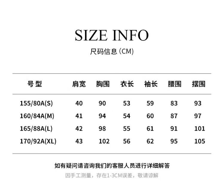 China (cm) 160-165/84-86 165-170 / 88-90 167-172 / 92-96 168-173 / 98-102 170-176 / 106-110