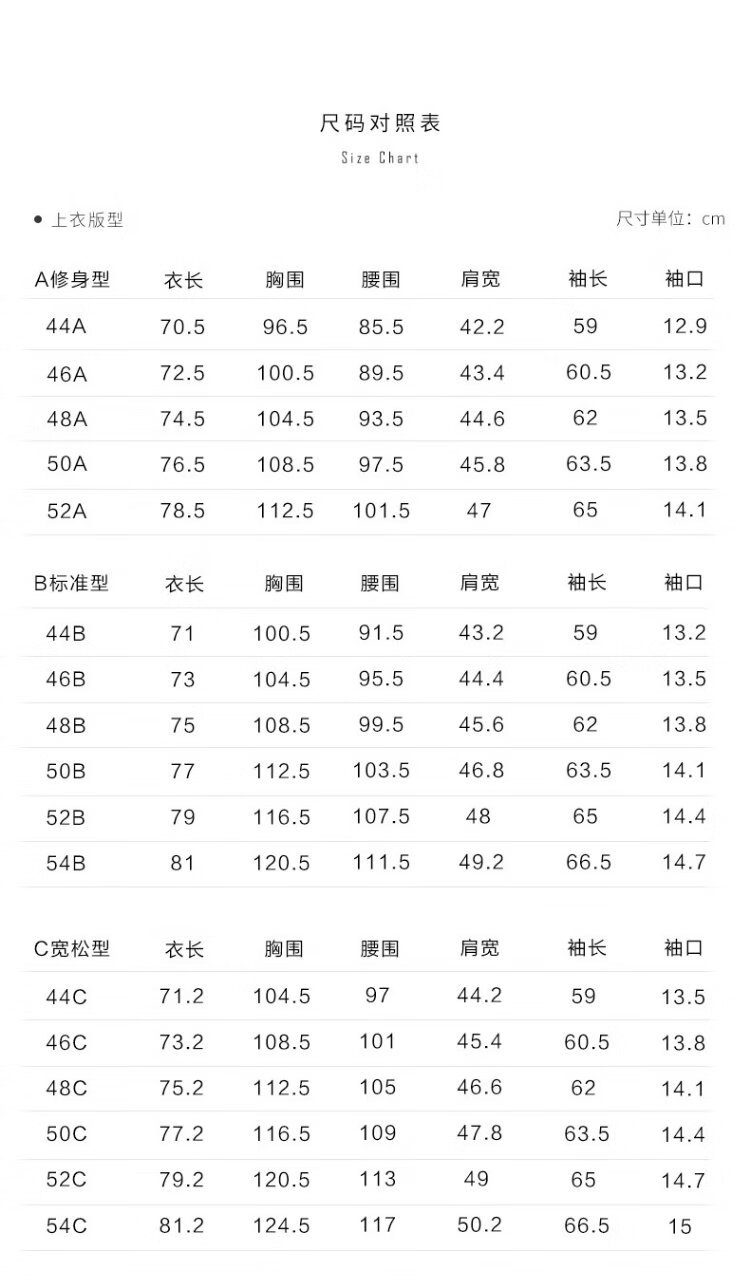 China (cm) 160-165/84-86 165-170 / 88-90 167-172 / 92-96 168-173 / 98-102 170-176 / 106-110