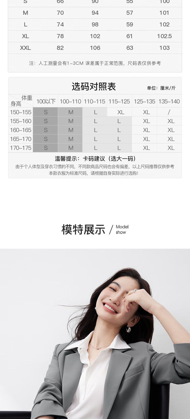 China (cm) 160-165/84-86 165-170 / 88-90 167-172 / 92-96 168-173 / 98-102 170-176 / 106-110