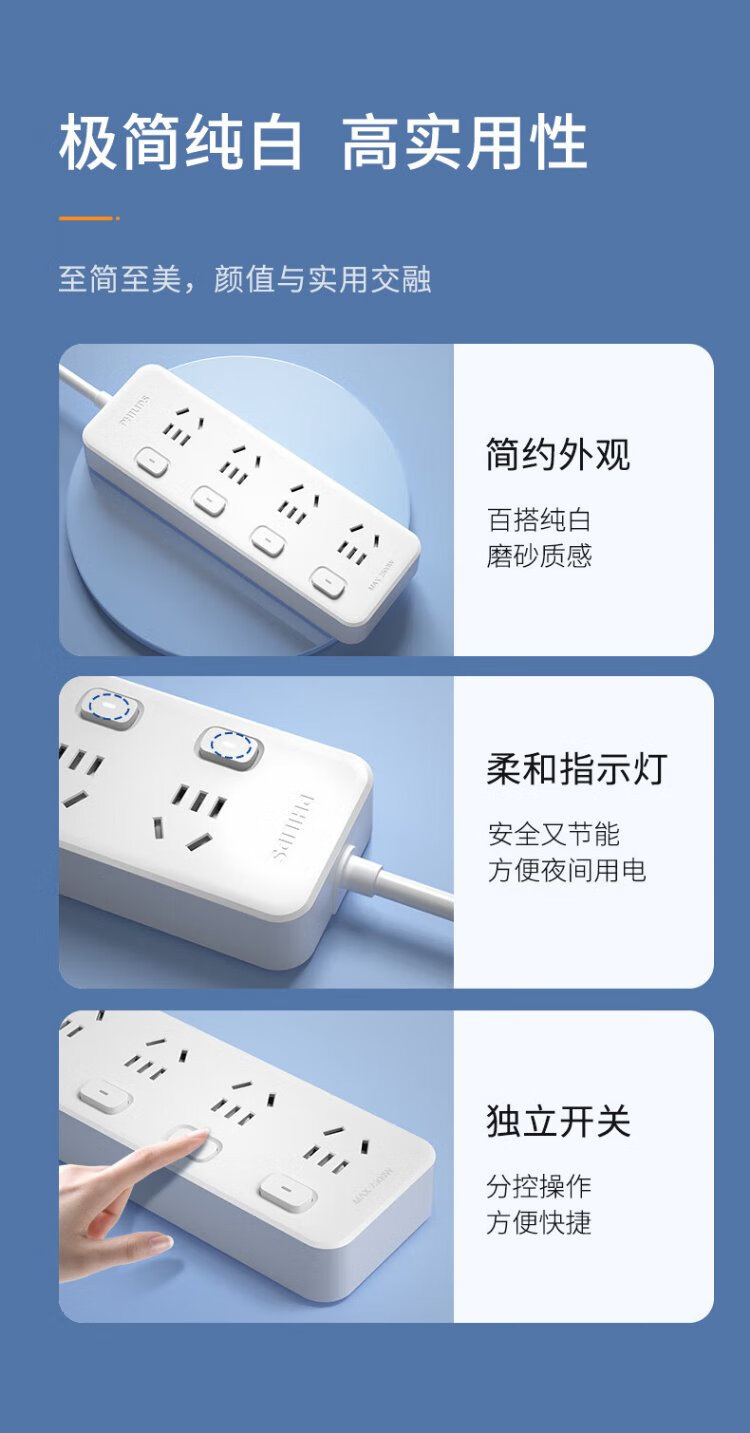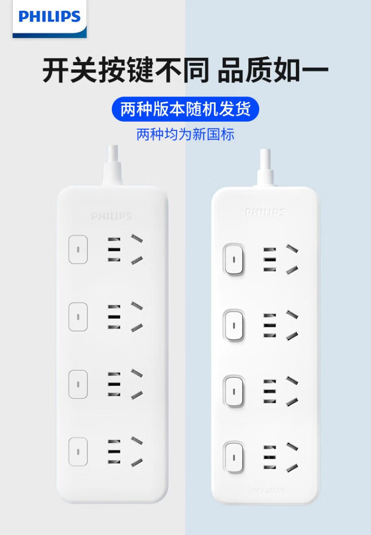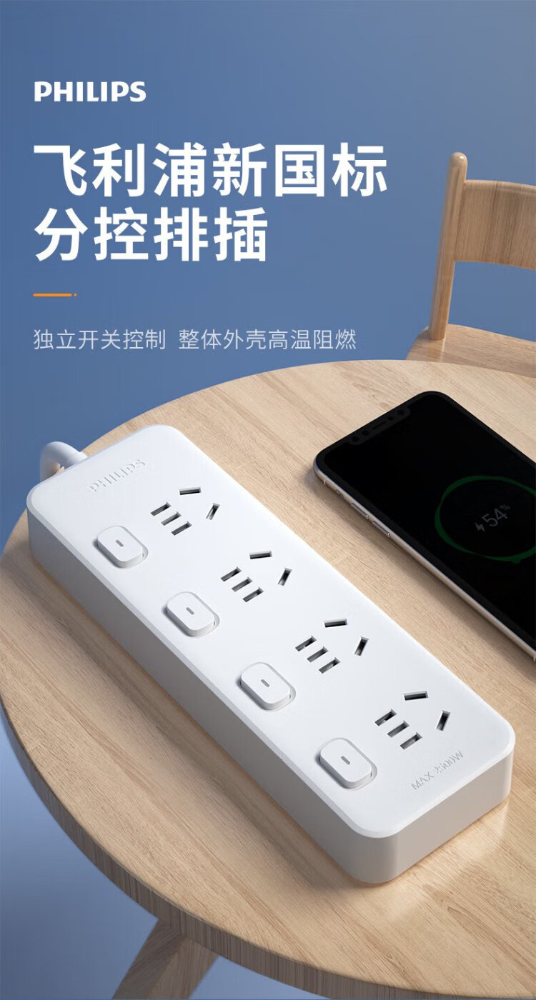 Philips (PHILIPS) new national standard safety plug strip socket 2 meters branch control 4-position plug strip branch control socket dormitory plug board/row plug/terminal board/pull line board independent switch 3140WP
