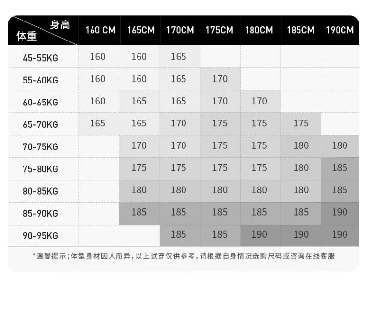China (cm) 160-165/84-86 165-170 / 88-90 167-172 / 92-96 168-173 / 98-102 170-176 / 106-110