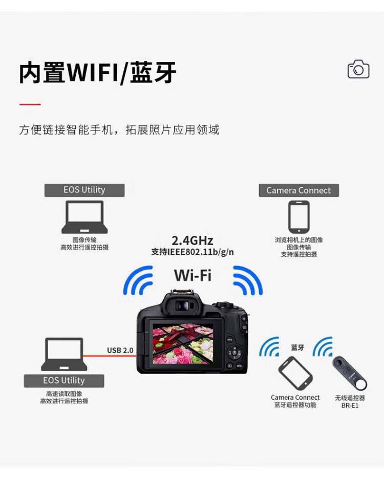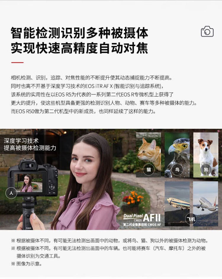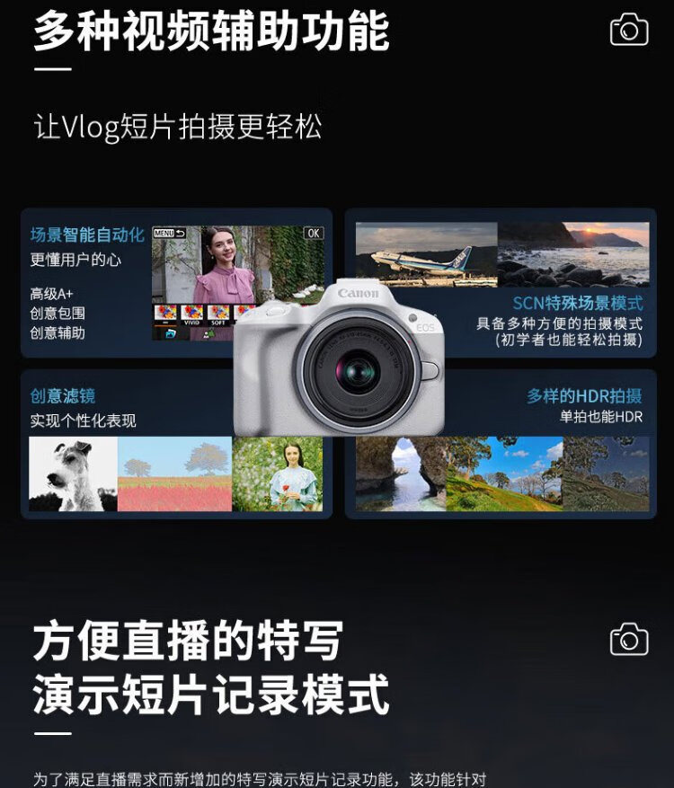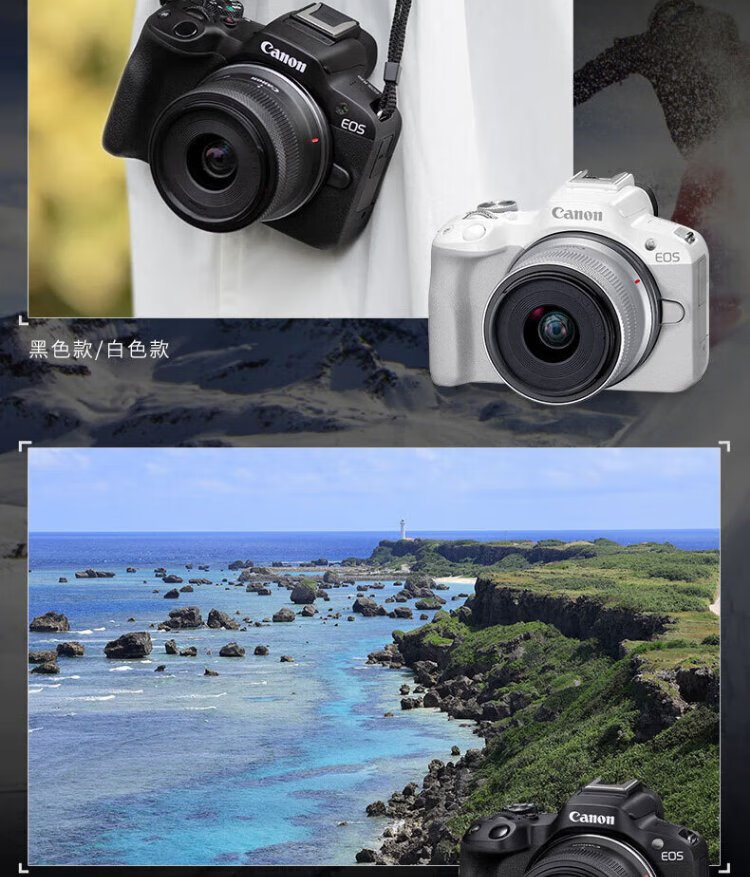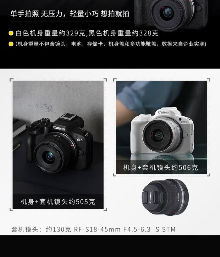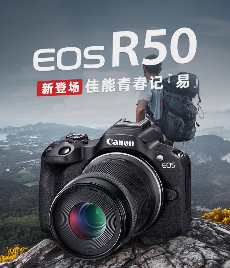 Canon only replaces but does not repair R50 mirrorless camera. Entry-level half-frame vlog4k video. Compact and portable. 18-45 set. Black comes with 1-year extended warranty.