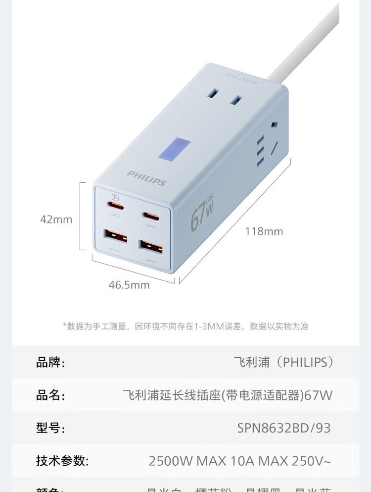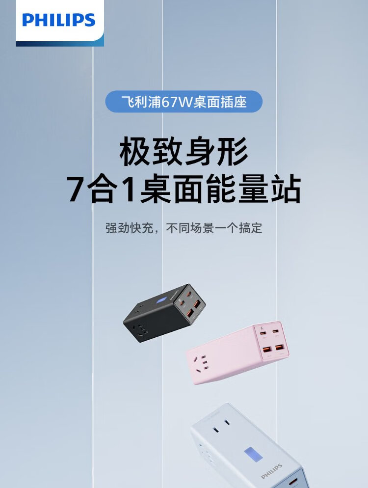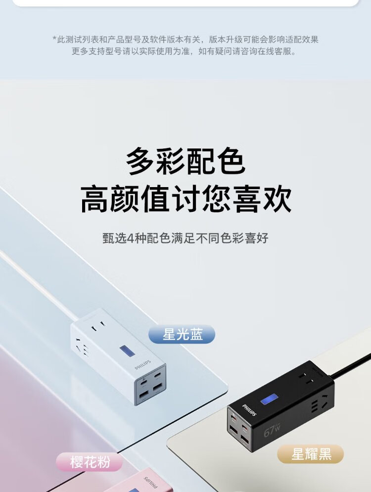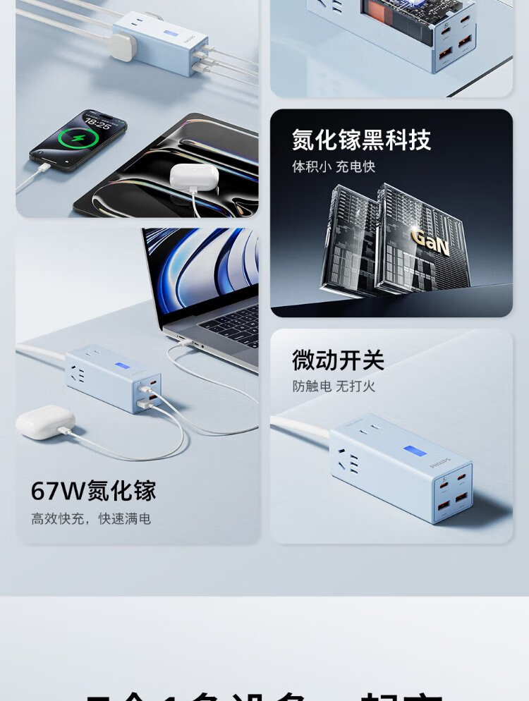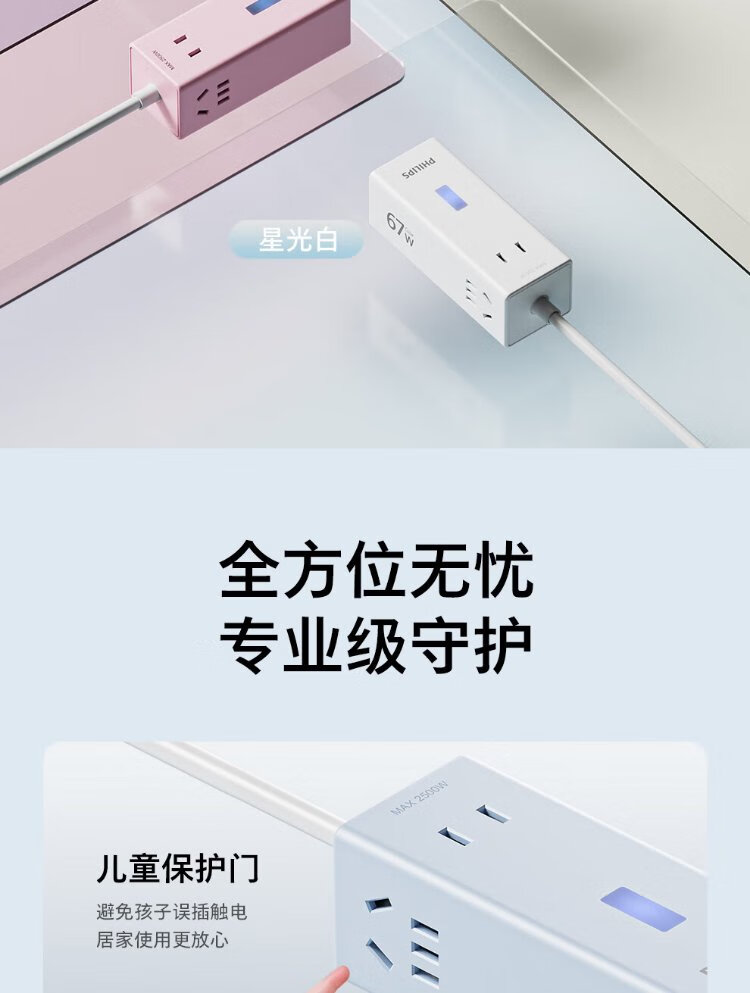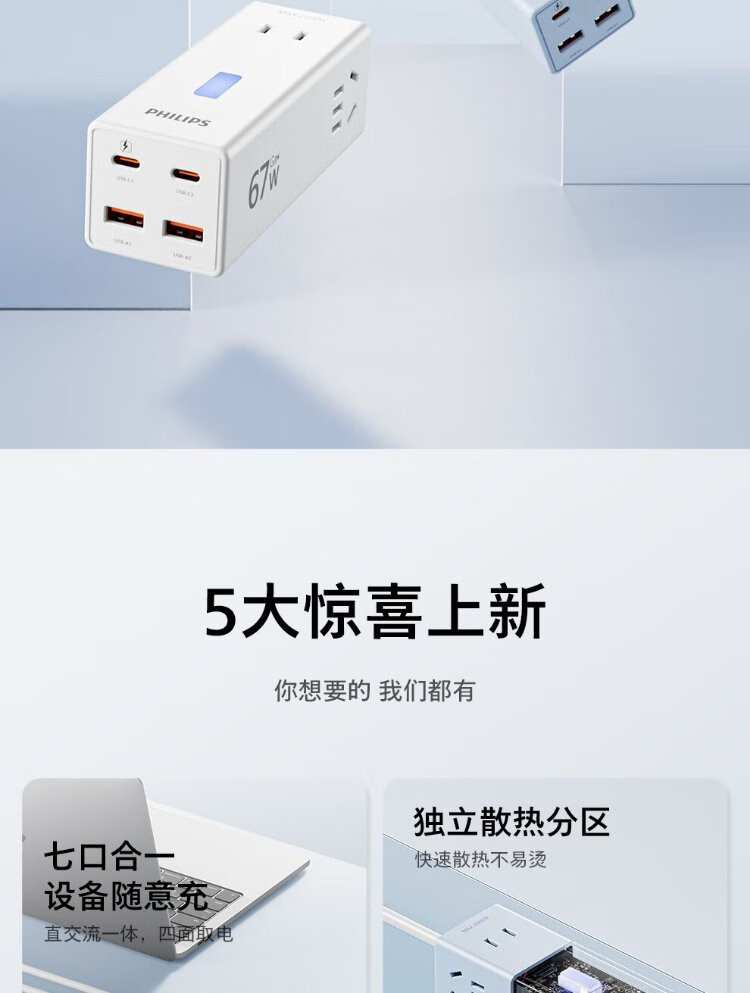 Philips (PHILIPS) Gallium Nitride 67W Charger Fast Charging Laptop Socket/Multifunctional USB Plug Board Portable Power Strip Small Power Cabin Safe Fast Charging 2C2A+3 Positions No Switch Black