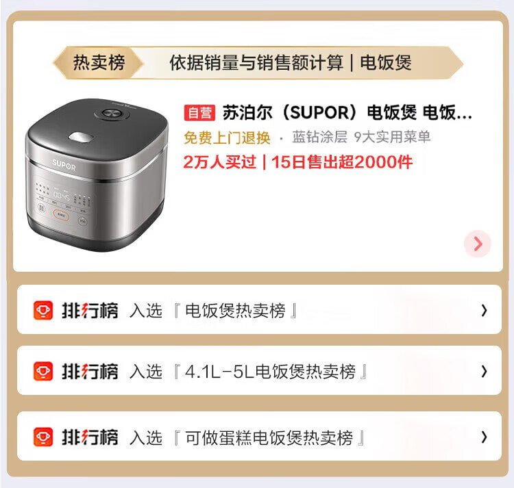 SUPOR gold list product 5 liters large capacity household 4-5 people smart multi-functional rice cooker rice cooker blue diamond round thick kettle liner SF50FC0054 micro pressure