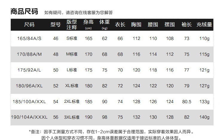 China (cm) 165 / 88-90 170 / 96-98 175 / 108-110 180 / 118-122 185 / 126-130