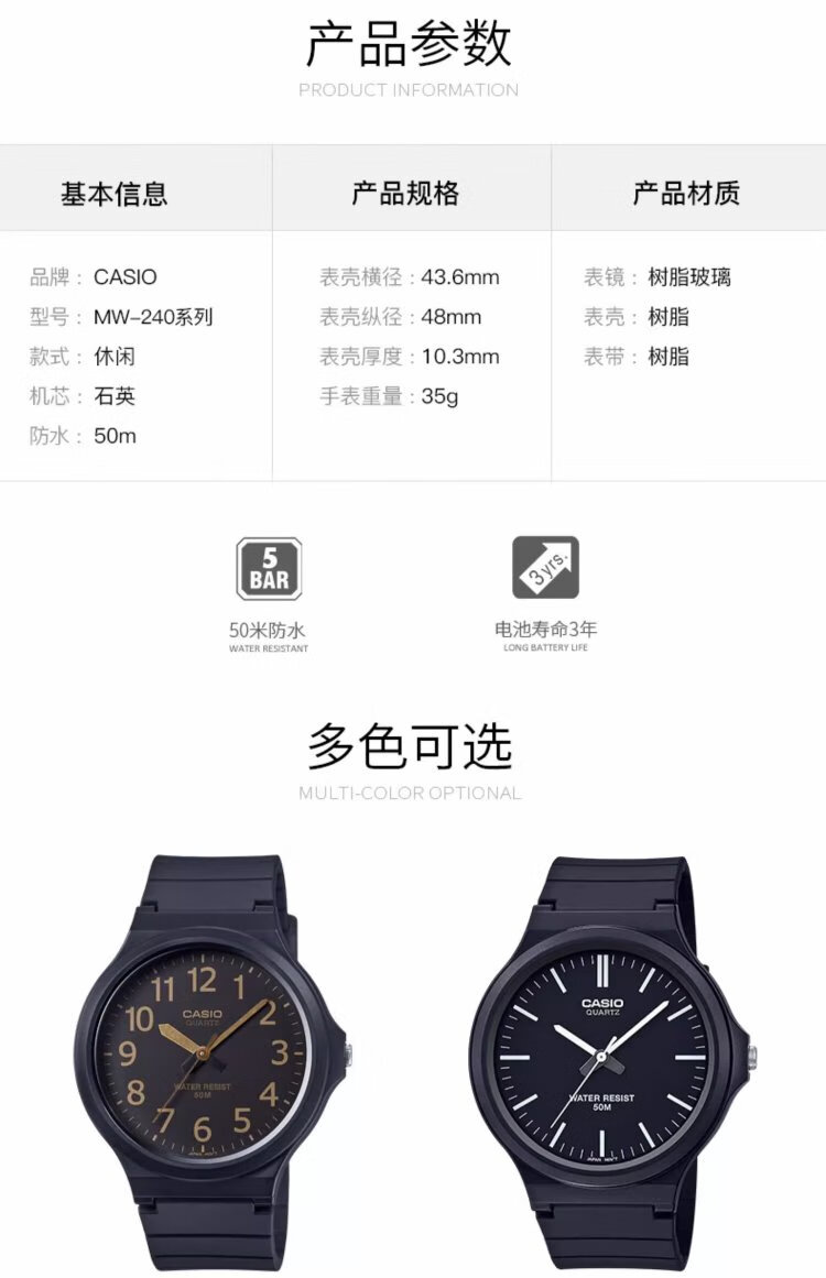 Casio (CASIO) watch men's small black watch timing student high school and high school exam watch unisex couple men and women quartz watch MW-240-7B