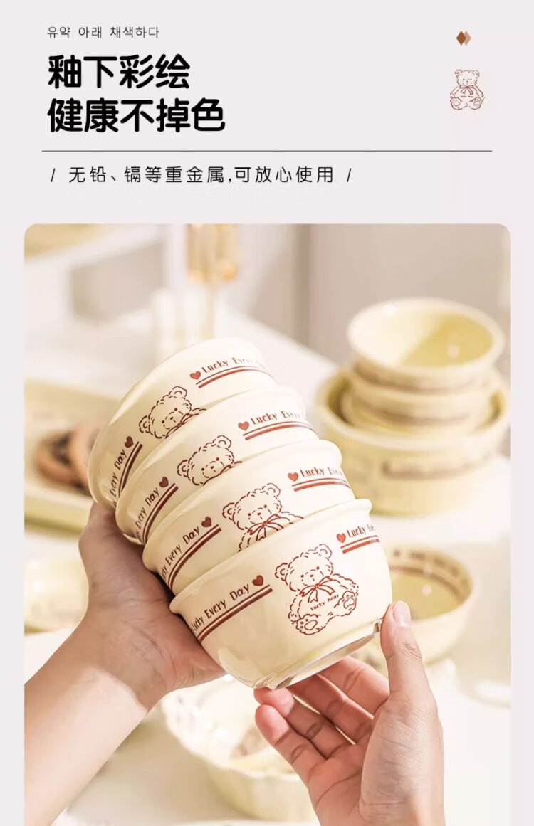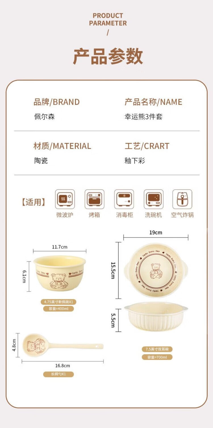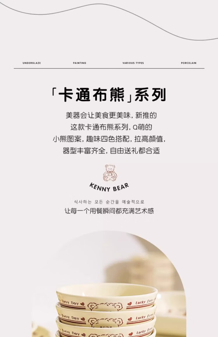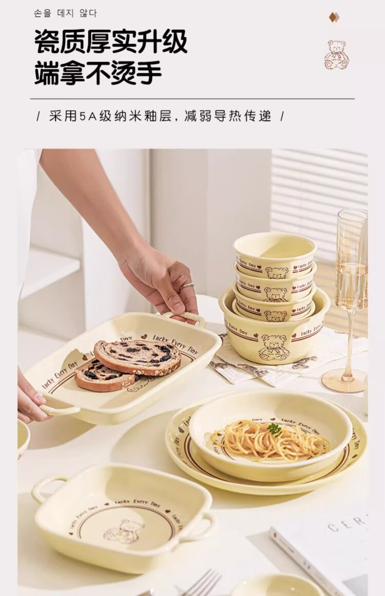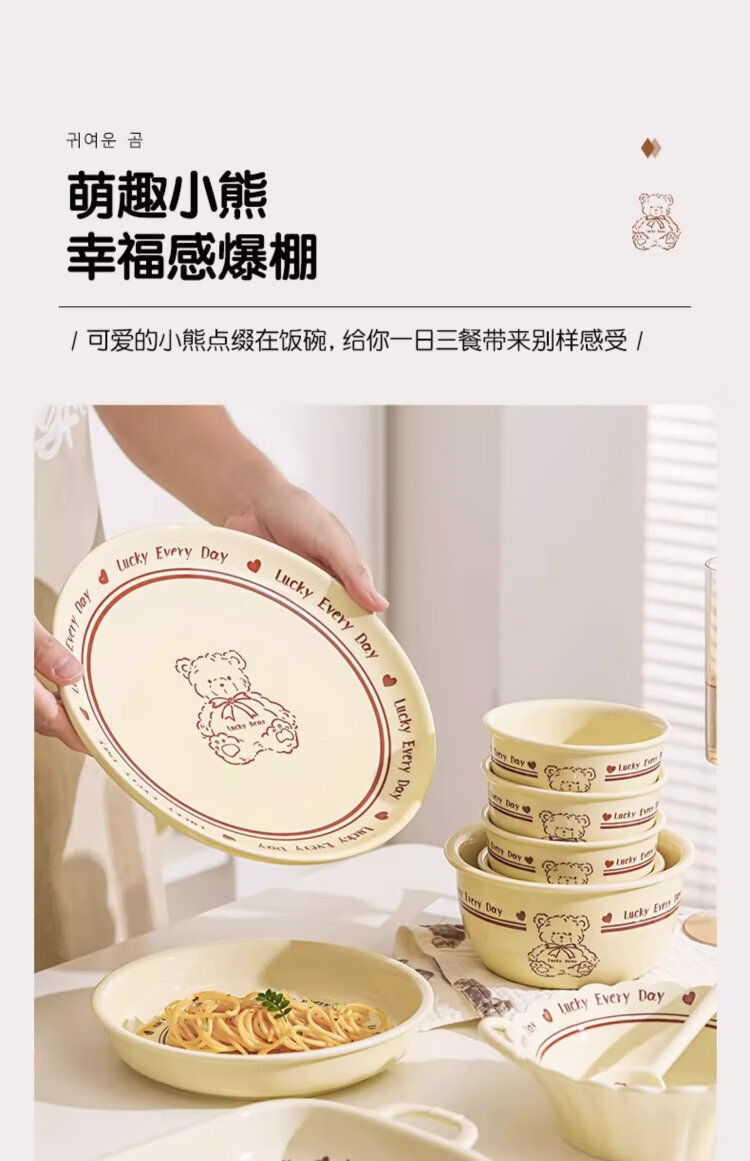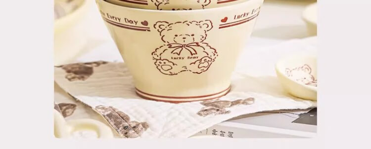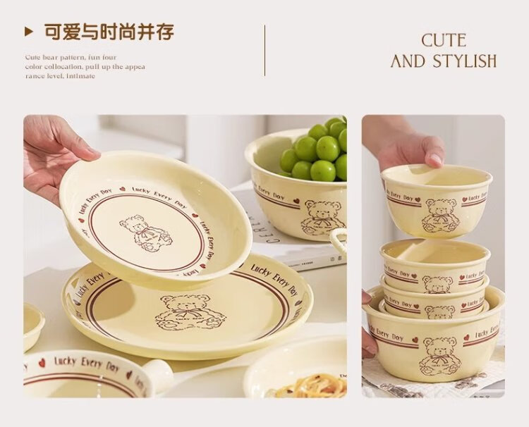 Persson cartoon cute 3-piece set of lucky bear ceramic tableware for home use for one person, underglaze color bowls and plates, complete set