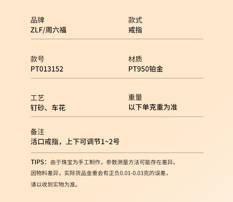 Saturday Fu PT950 Huaguan platinum ring live girl birthday gift PT013152 No. 13, about 1.72g