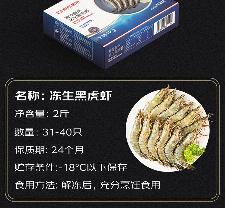 Jingdong Supermarket directly sourced black tiger shrimp from overseas, net weight 2Jin Jin is equal to 0.5kg, 31-40 pieces/box, single frozen, prawn barbecue hot pot ingredients