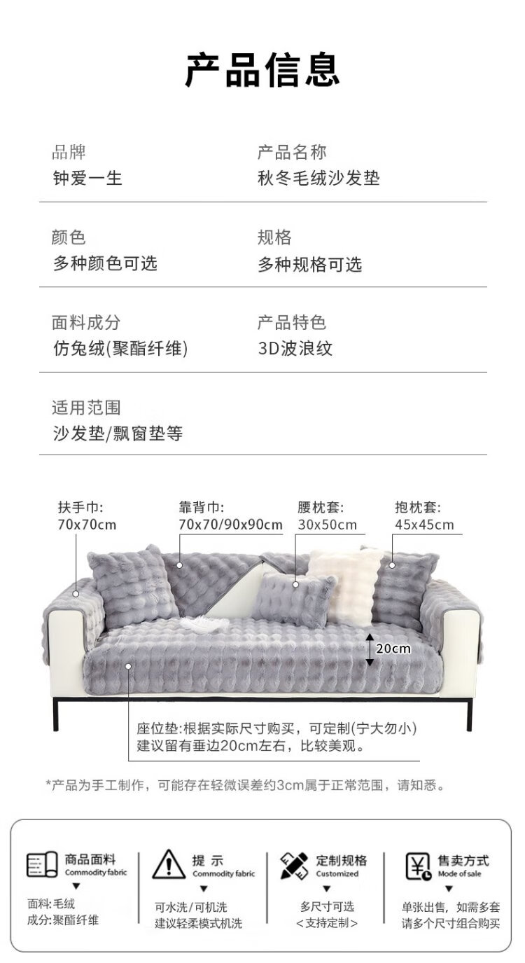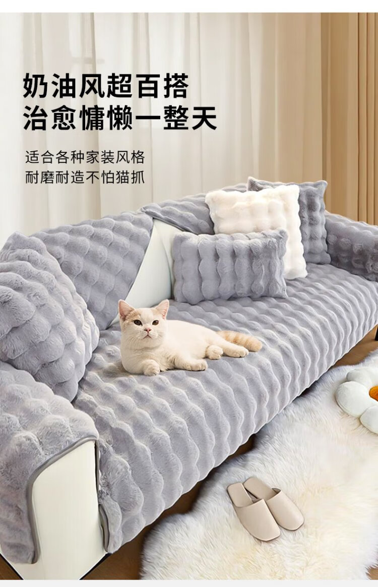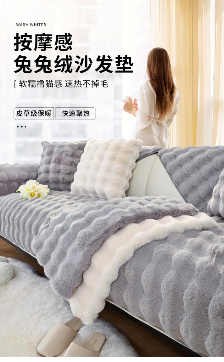 Love Life Rabbit Plush Sofa Cushion Winter Thickened Sofa Seat Cushion Cover Armrest Towel Cover Non-Slip Gray 70*70cm