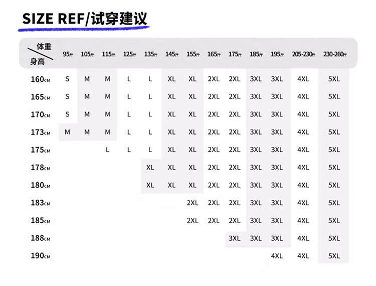 China (cm) 160-165/84-86 165-170 / 88-90 167-172 / 92-96 168-173 / 98-102 170-176 / 106-110