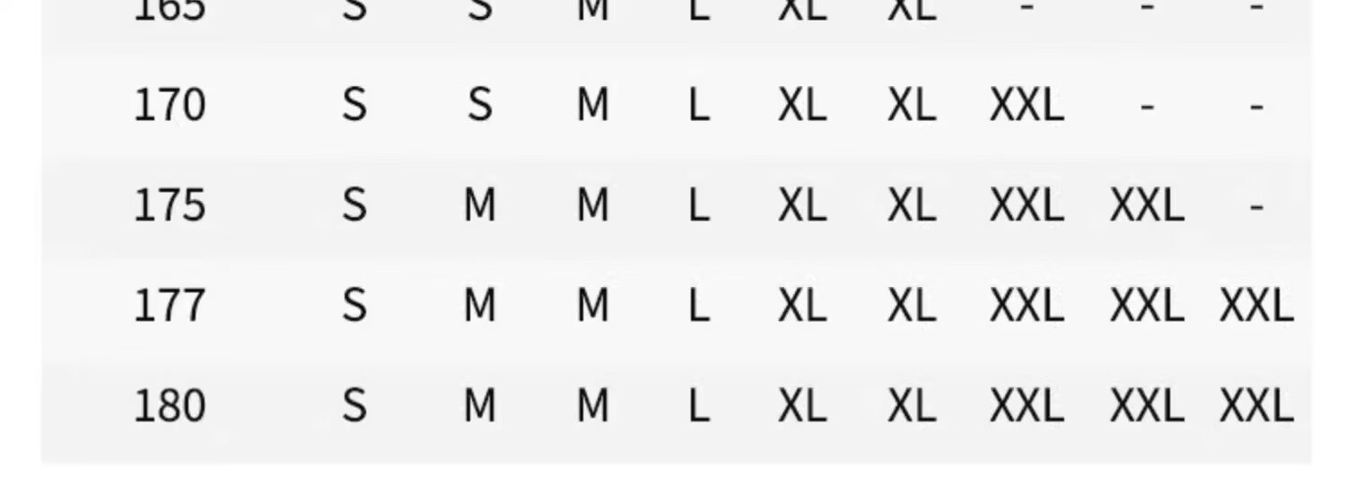 China (cm) 165 / 88-90 170 / 96-98 175 / 108-110 180 / 118-122 185 / 126-130