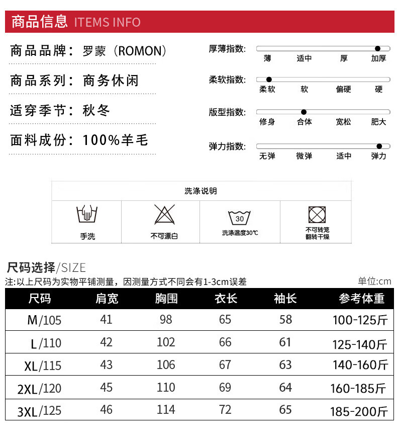 China (cm) 165 / 88-90 170 / 96-98 175 / 108-110 180 / 118-122 185 / 126-130