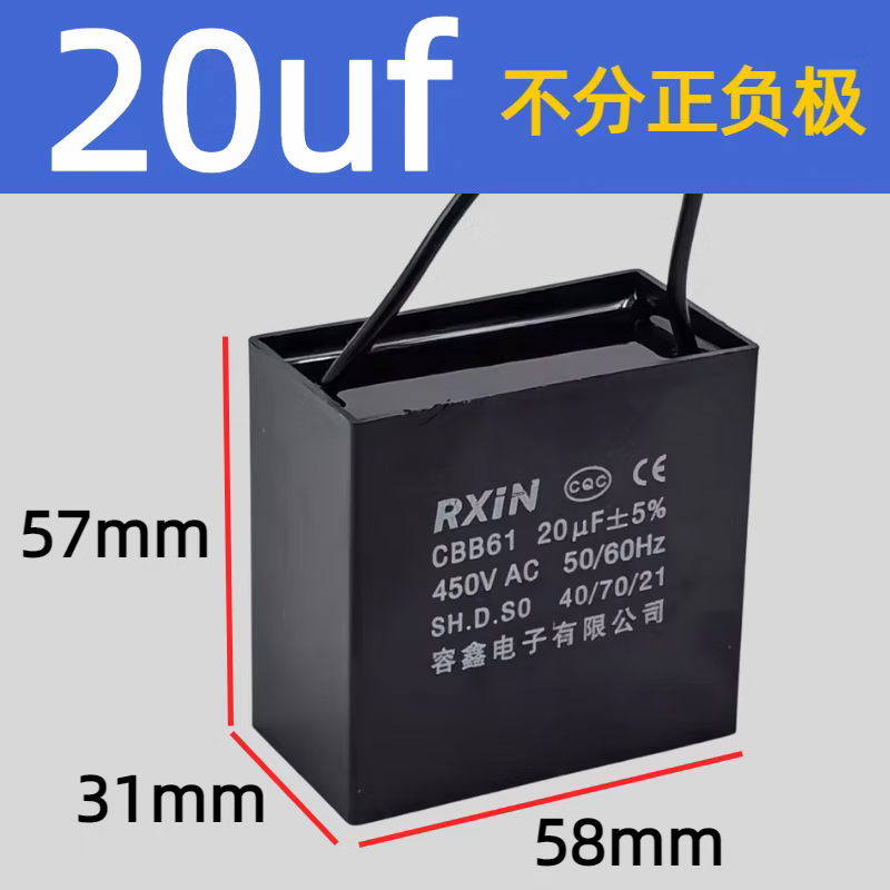 RXiN Rongxin starting capacitor CBB61 450V 20uF line fan starting stepless capacitor motor starting capacitor 1 piece