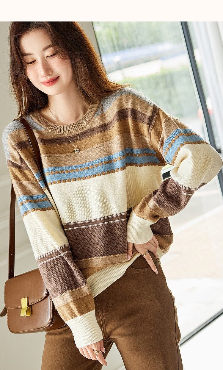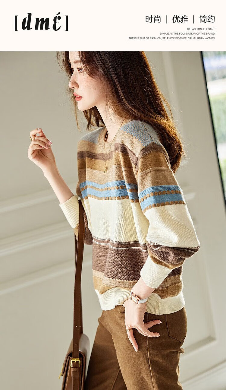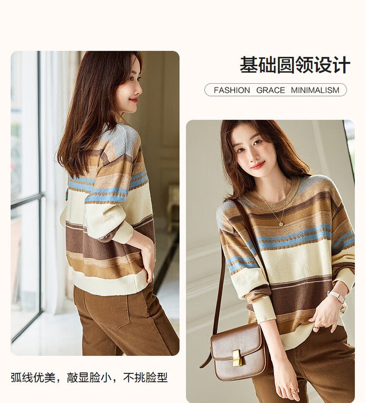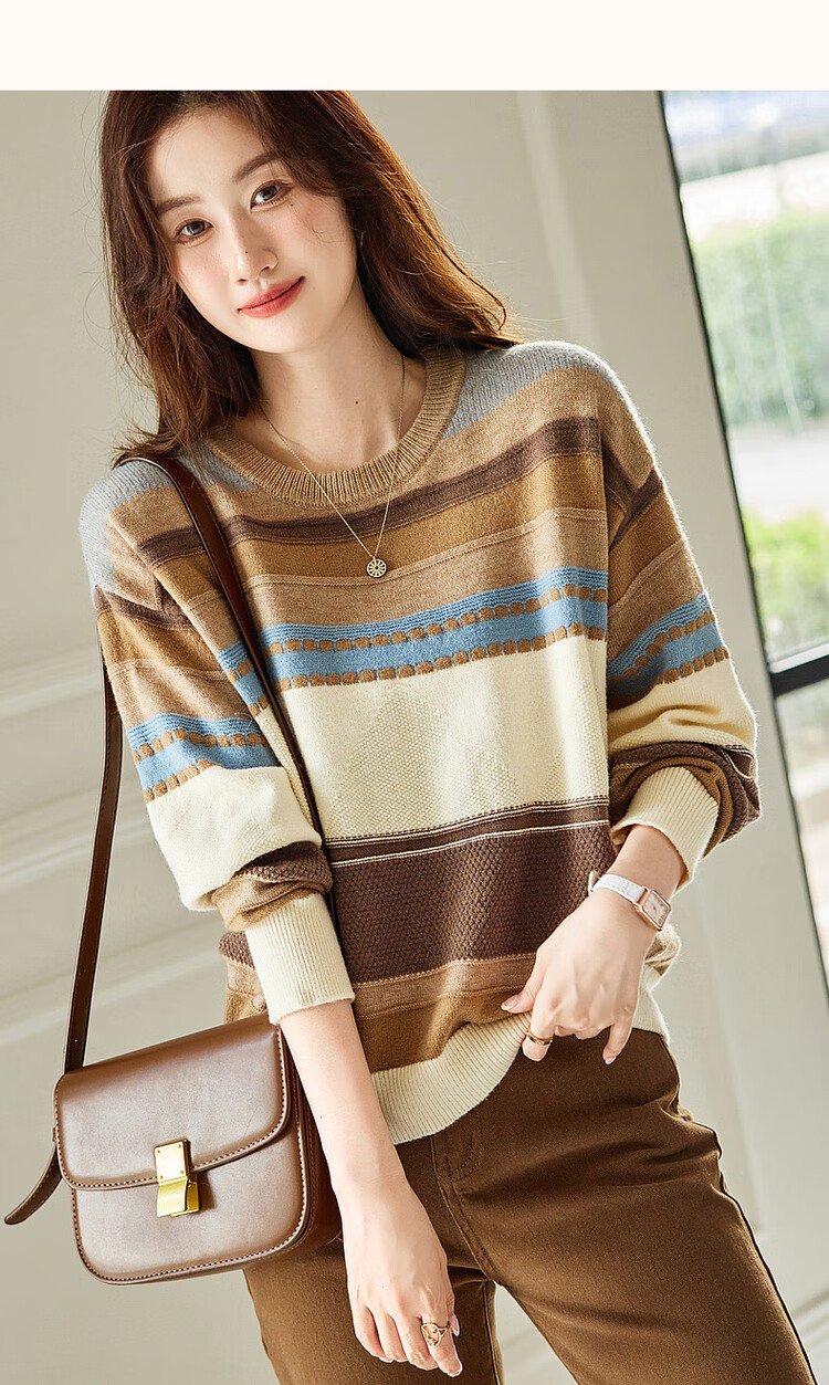 Demana Light Mature Commuting 2025 Winter Round Neck Velvet Yarn Striped Contrast Color Sweater Long Sleeve Knitted Sweater Women's Top