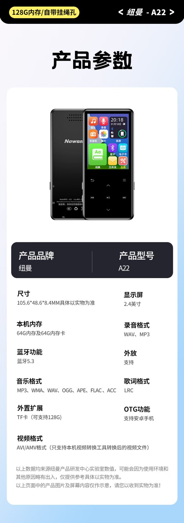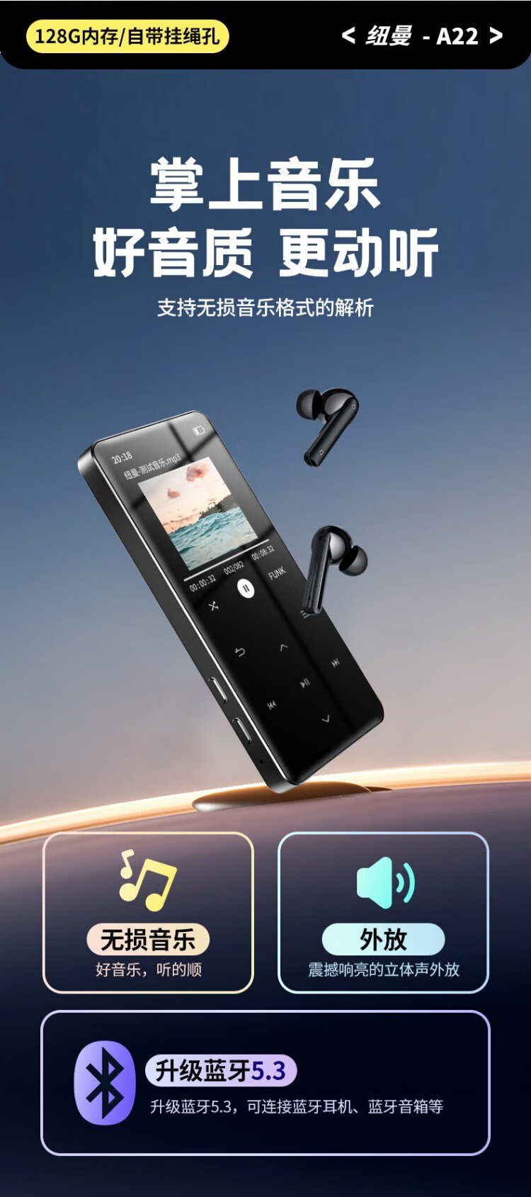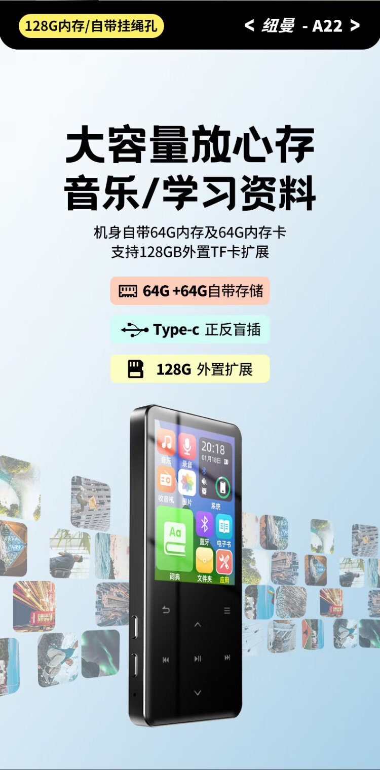 Newman A22 128G mp3/mp4 Bluetooth lossless player 2.4-inch junior high school student walkman Bluetooth 5.3 audio and video external e-book touch black