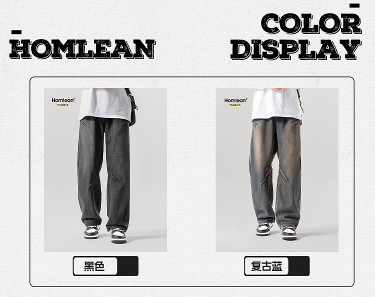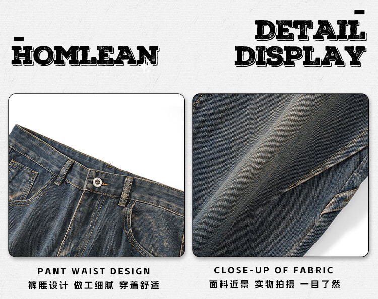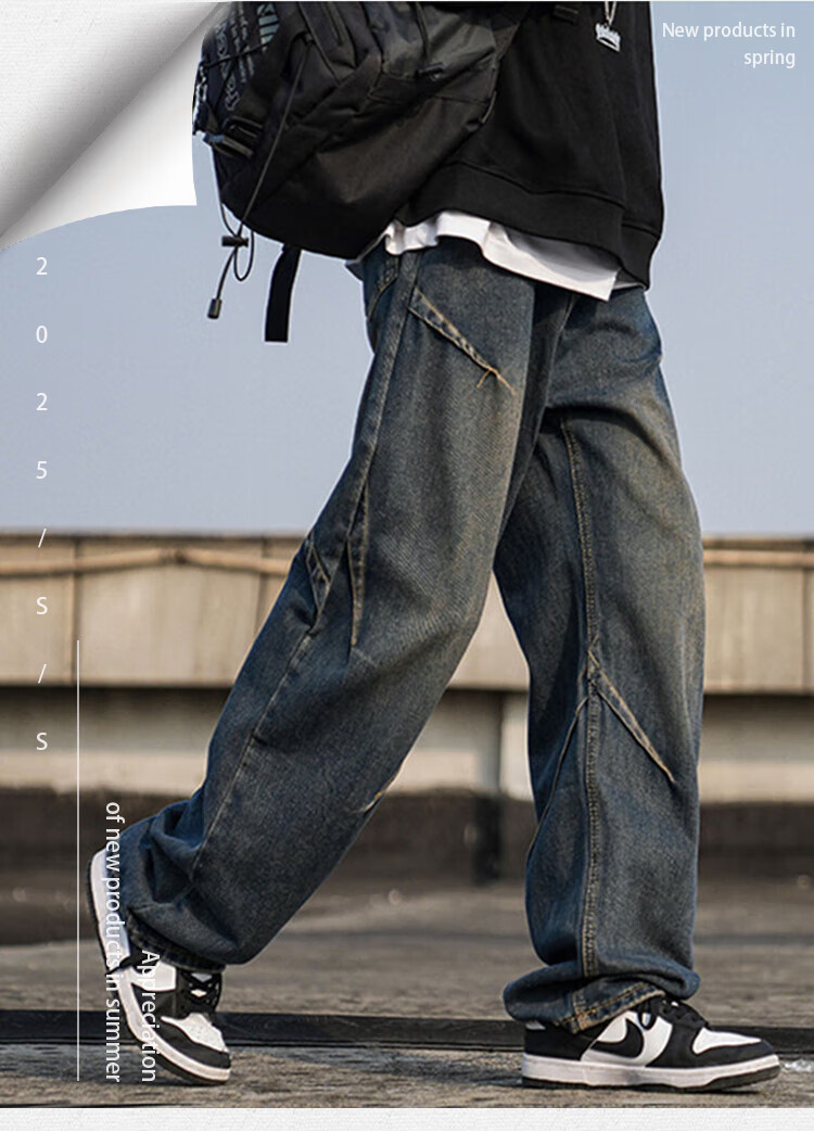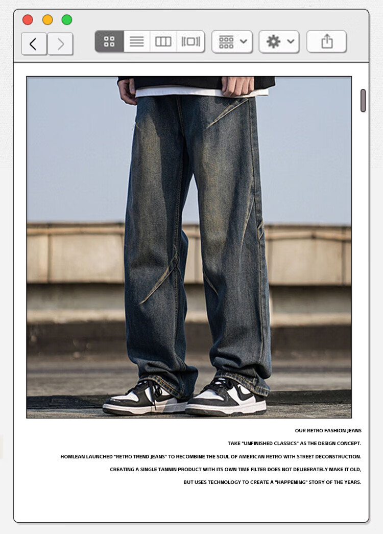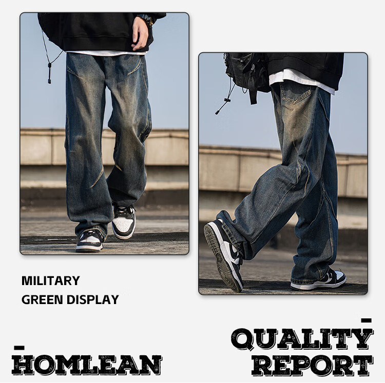Homlean washed retro jeans men's spring and summer American loose pleated design straight long pants HS04 retro blue XL