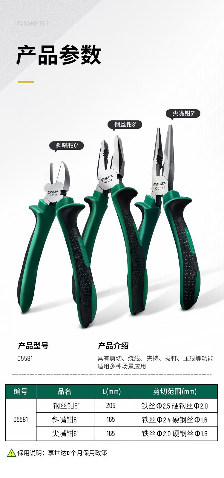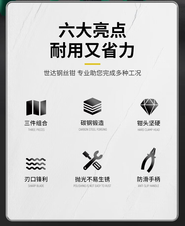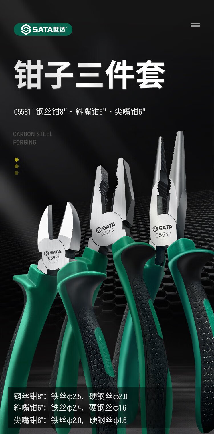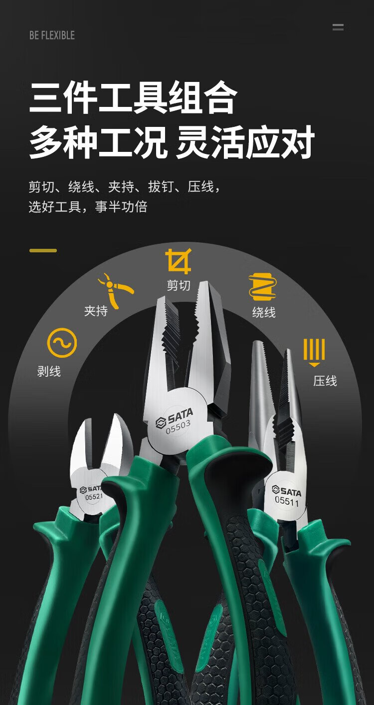 SATA pliers three-piece set tiger wire pliers needle nose pliers diagonal nose pliers labor-saving clamping electrician tool vise