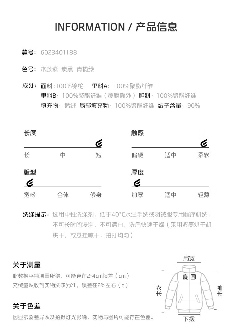 China (cm) 165 / 88-90 170 / 96-98 175 / 108-110 180 / 118-122 185 / 126-130