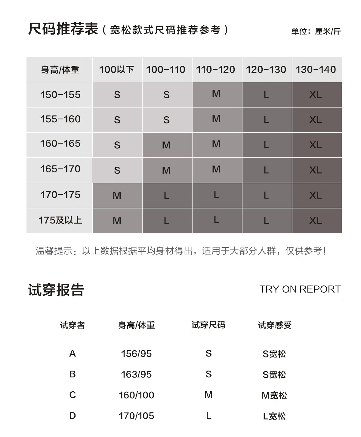 China (cm) 160-165/84-86 165-170 / 88-90 167-172 / 92-96 168-173 / 98-102 170-176 / 106-110