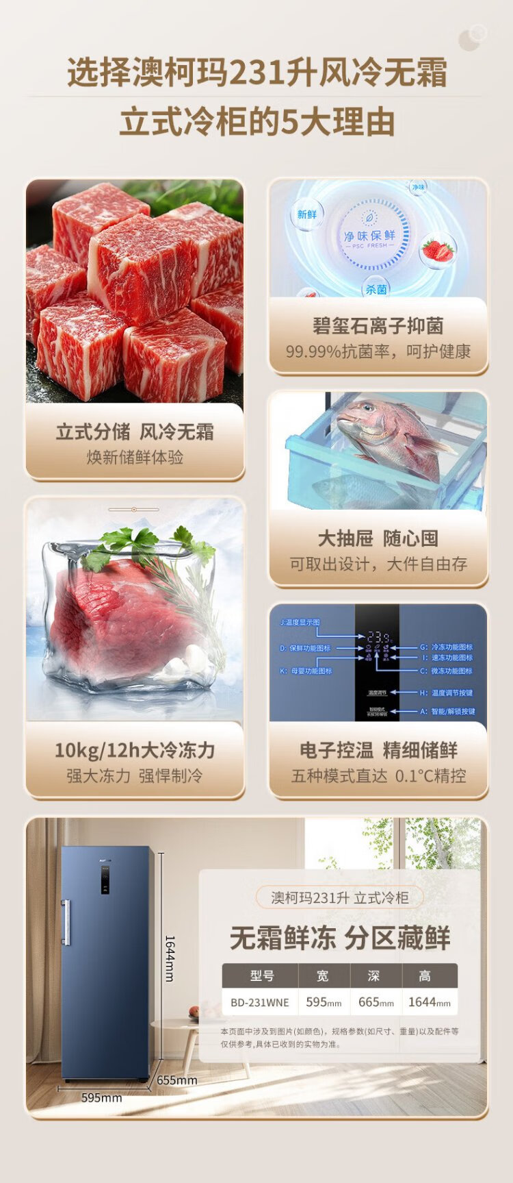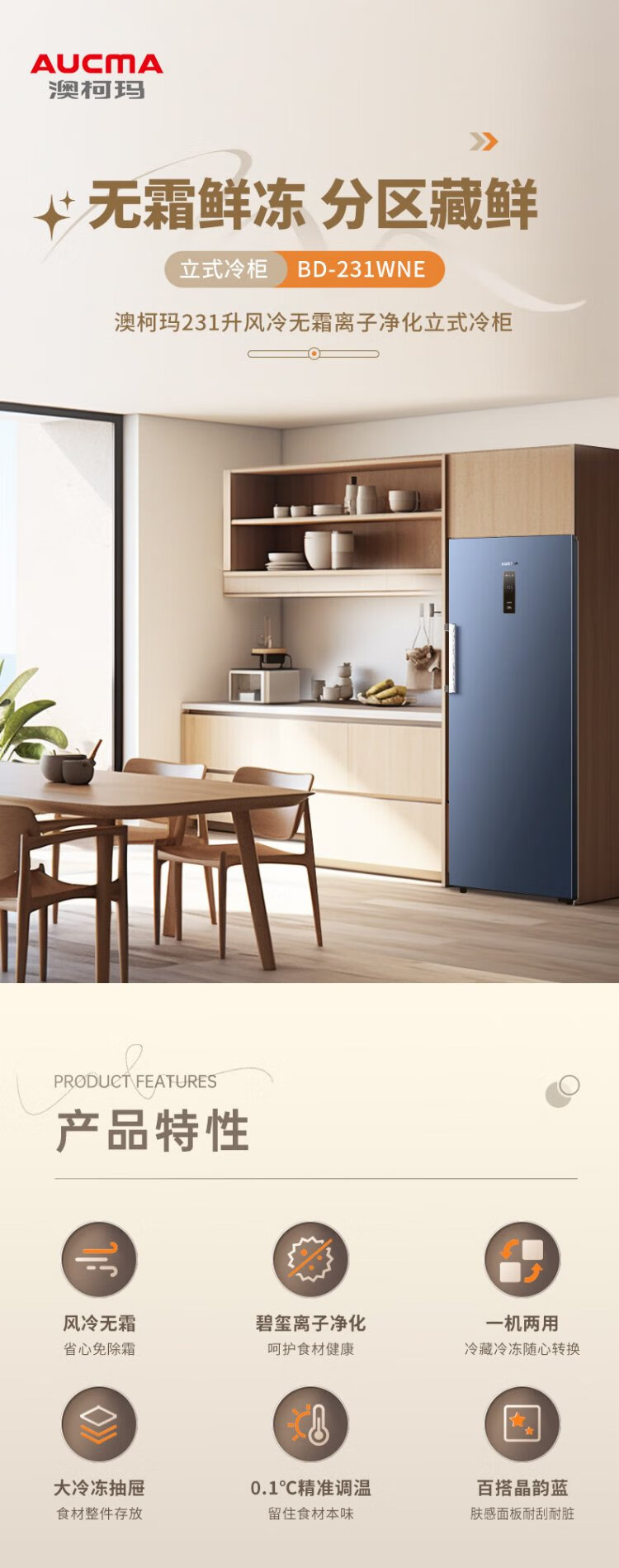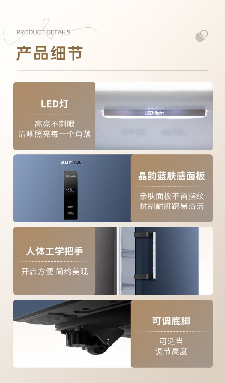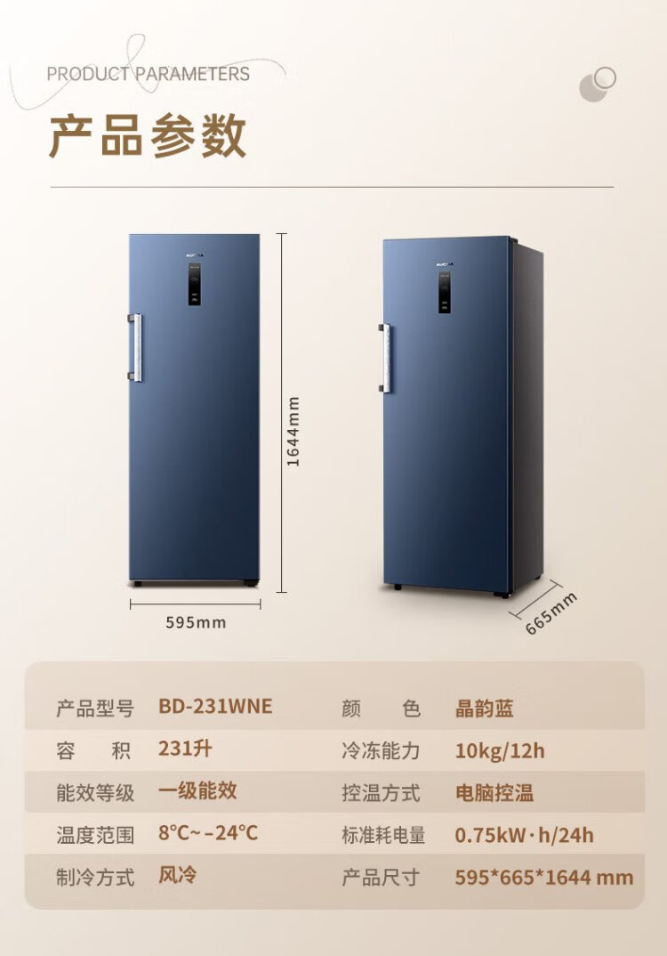 澳柯玛(AUCMA)231升立式冰柜冷柜风冷无霜一级能效家用母乳冷藏全冷冻抽屉式单开门小冰箱BD-231WNE 国家补贴