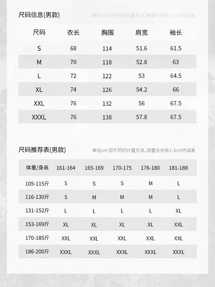 China (cm) 165 / 88-90 170 / 96-98 175 / 108-110 180 / 118-122 185 / 126-130
