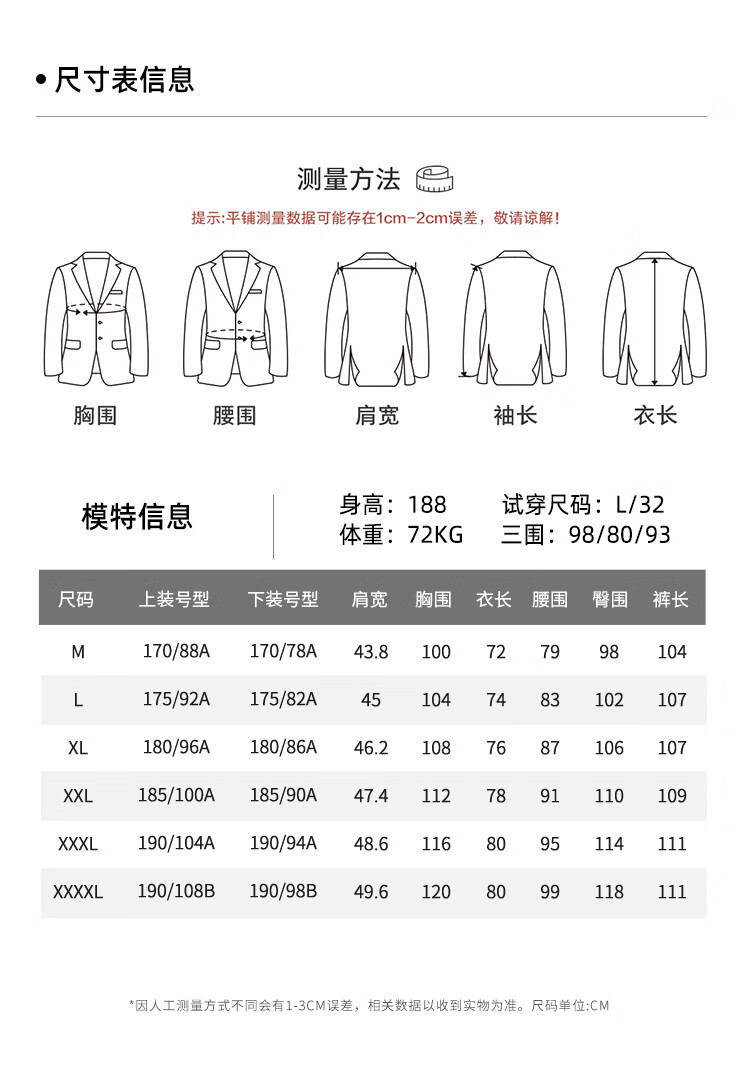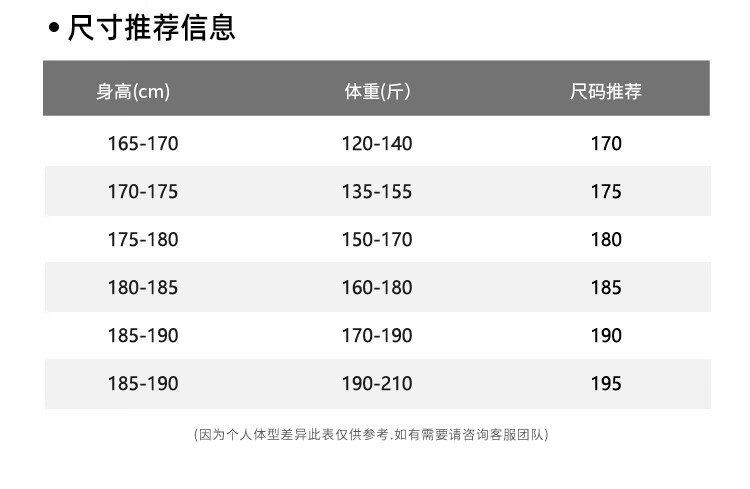 China (cm) 165 / 88-90 170 / 96-98 175 / 108-110 180 / 118-122 185 / 126-130