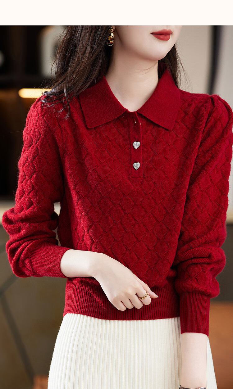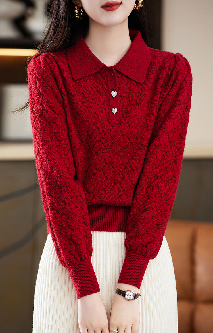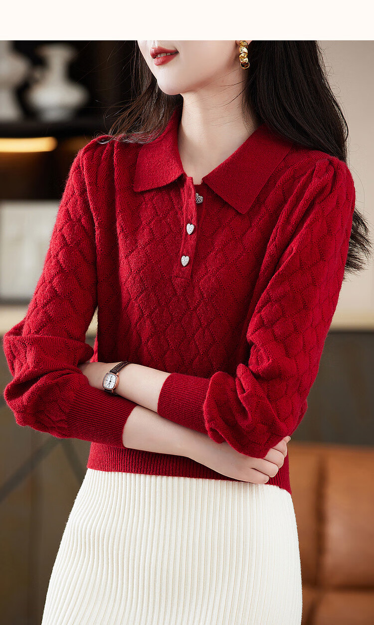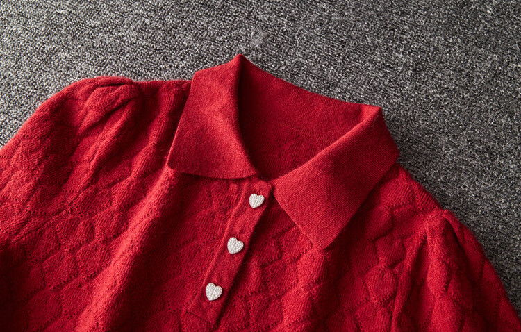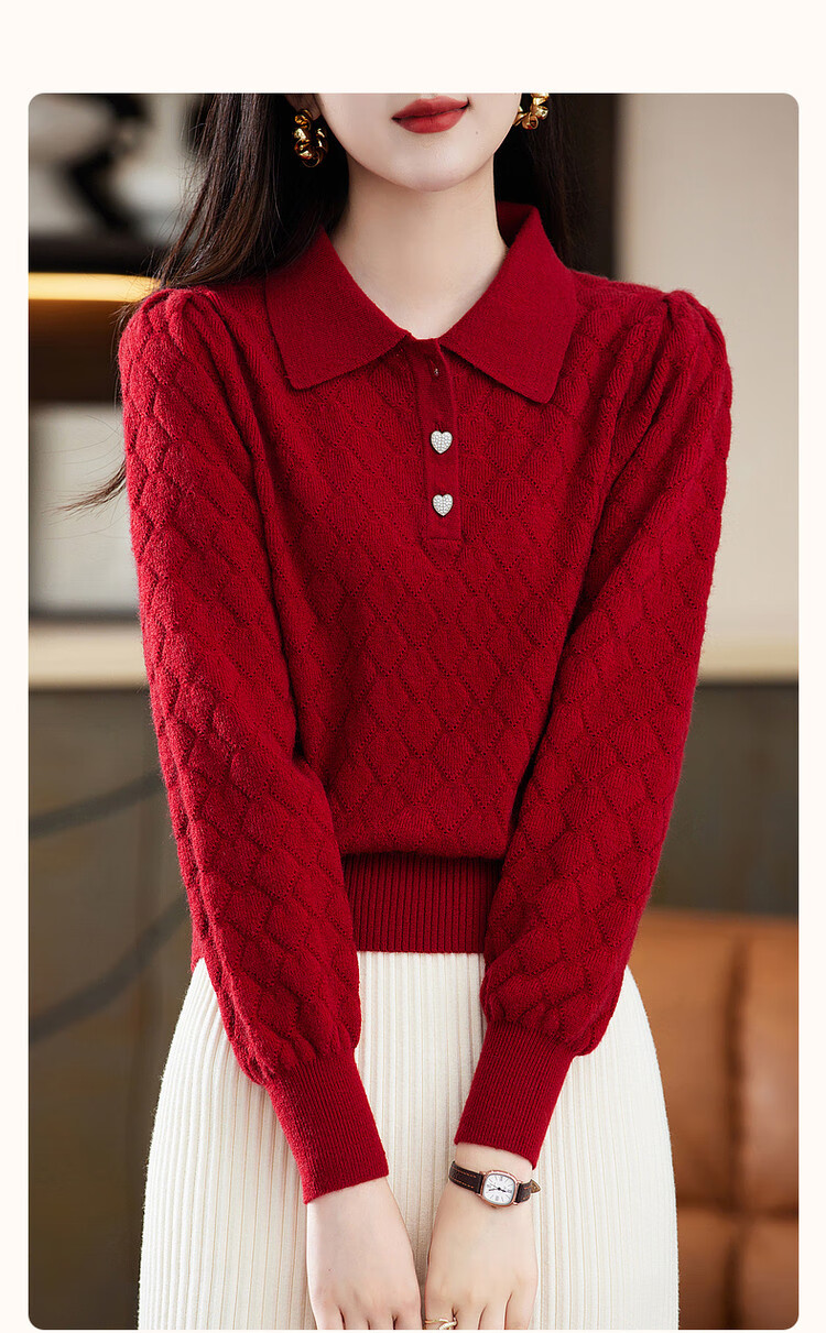 Demana Autumn and Winter Retro Style Love Button Lapel Sweater Puff Sleeve Slim Knitwear Women's High-Quality