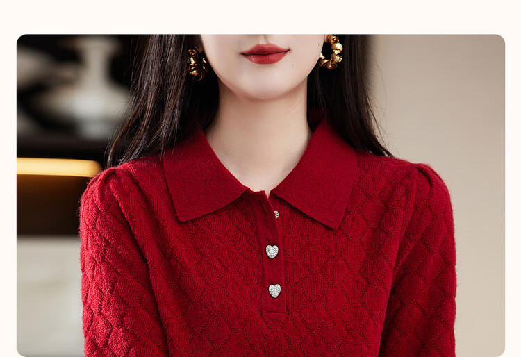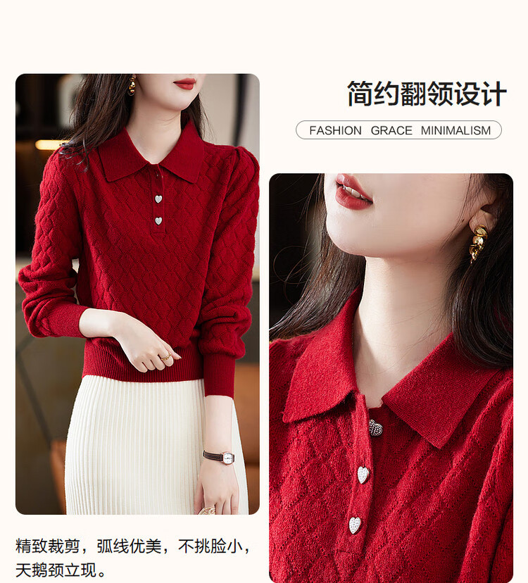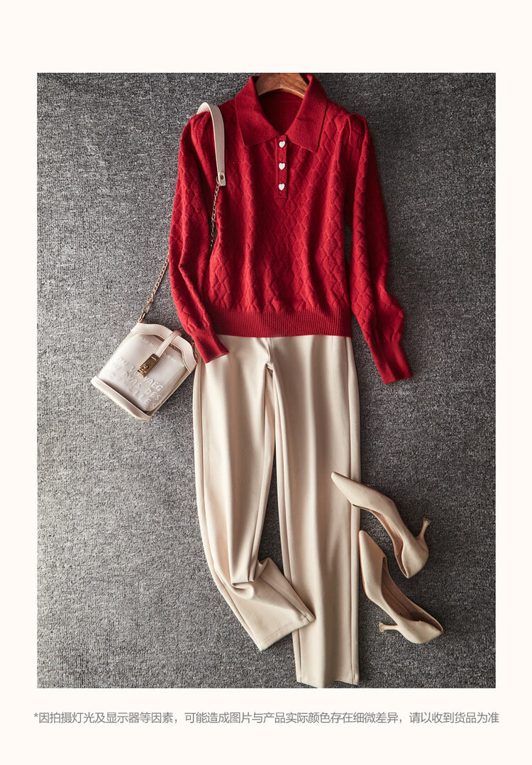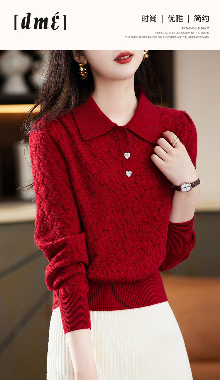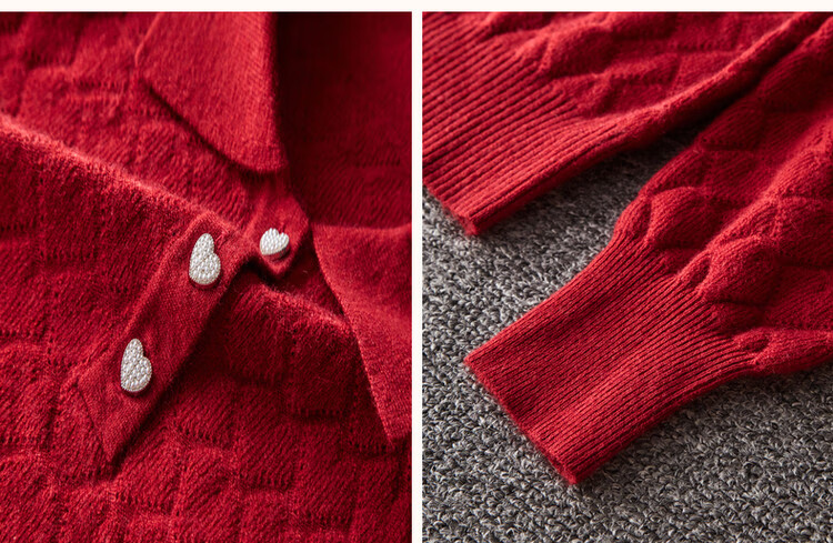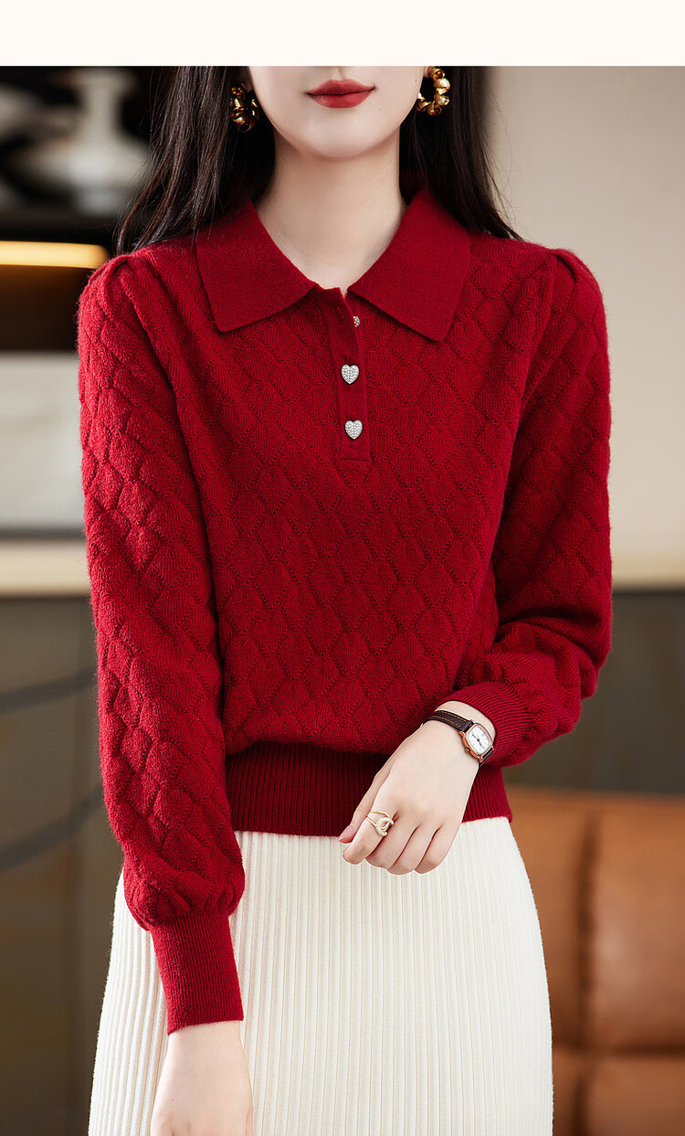 Demana Autumn and Winter Retro Style Love Button Lapel Sweater Puff Sleeve Slim Knitwear Women's High-Quality