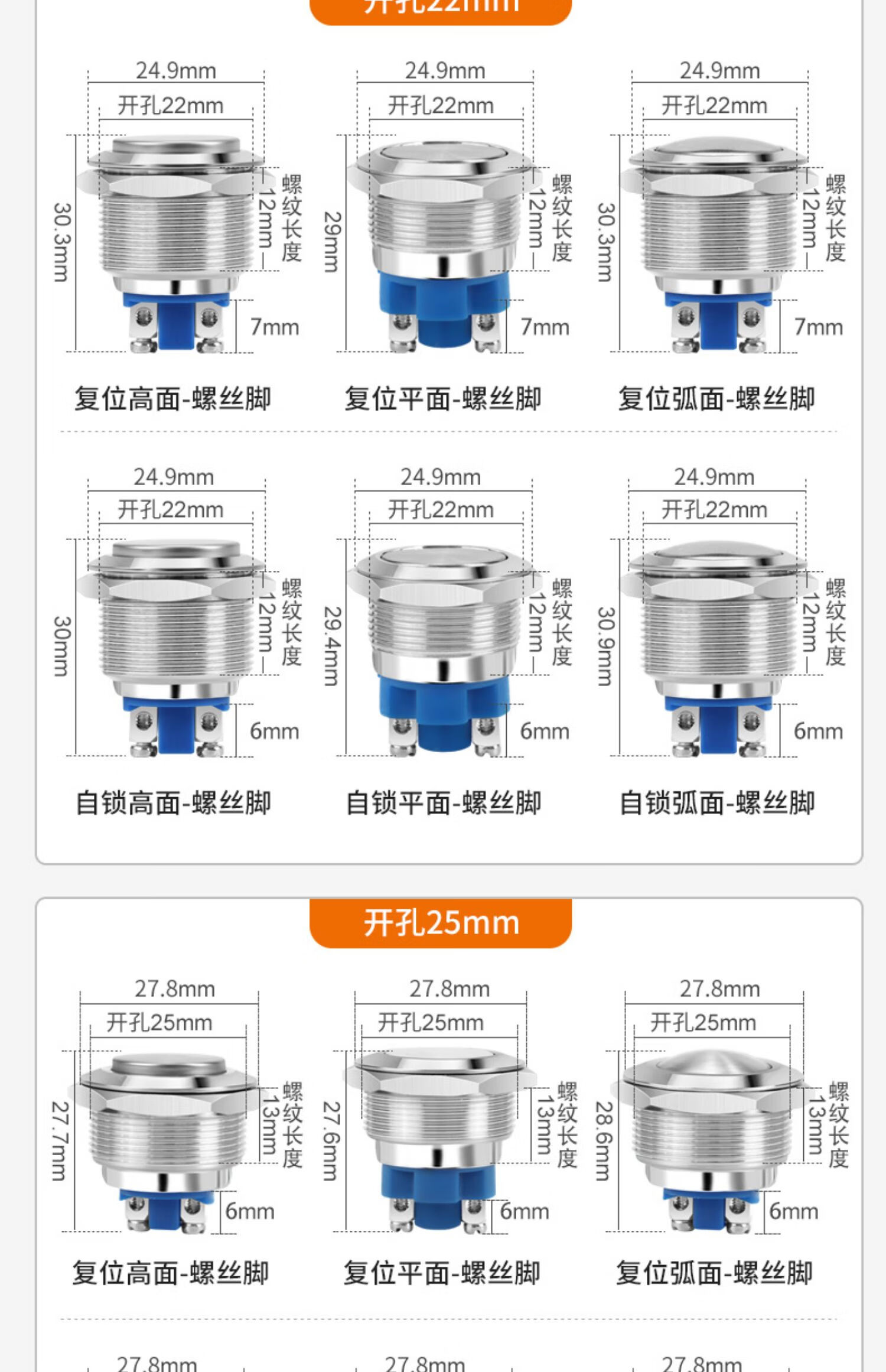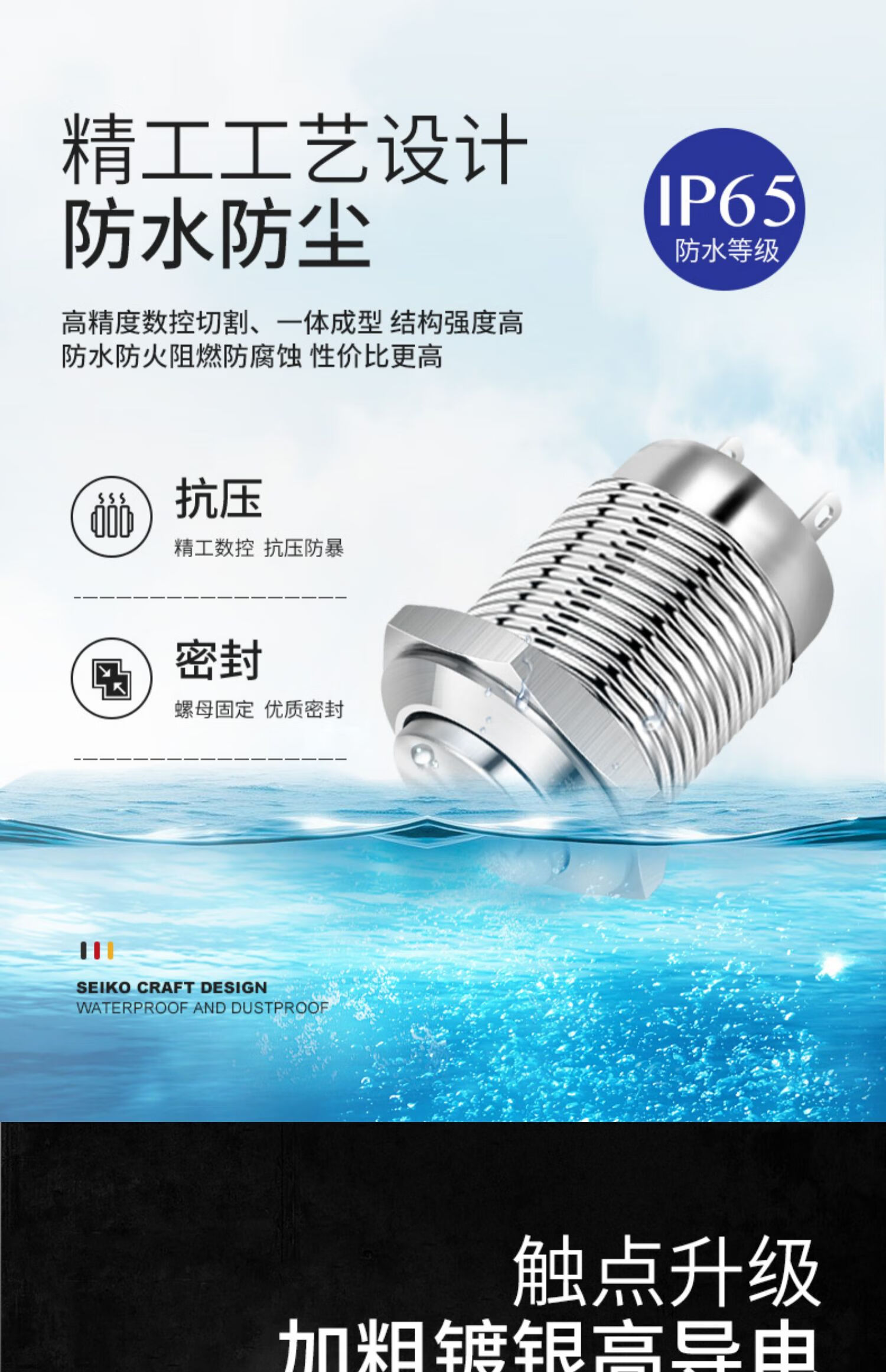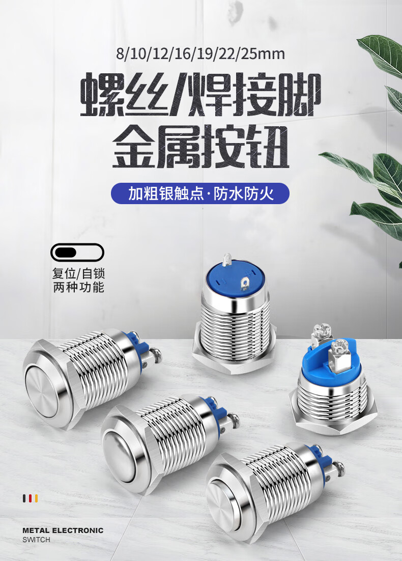 Huijun metal button switch waterproof small start stop switch power supply 16mm reset metal high head screw foot
