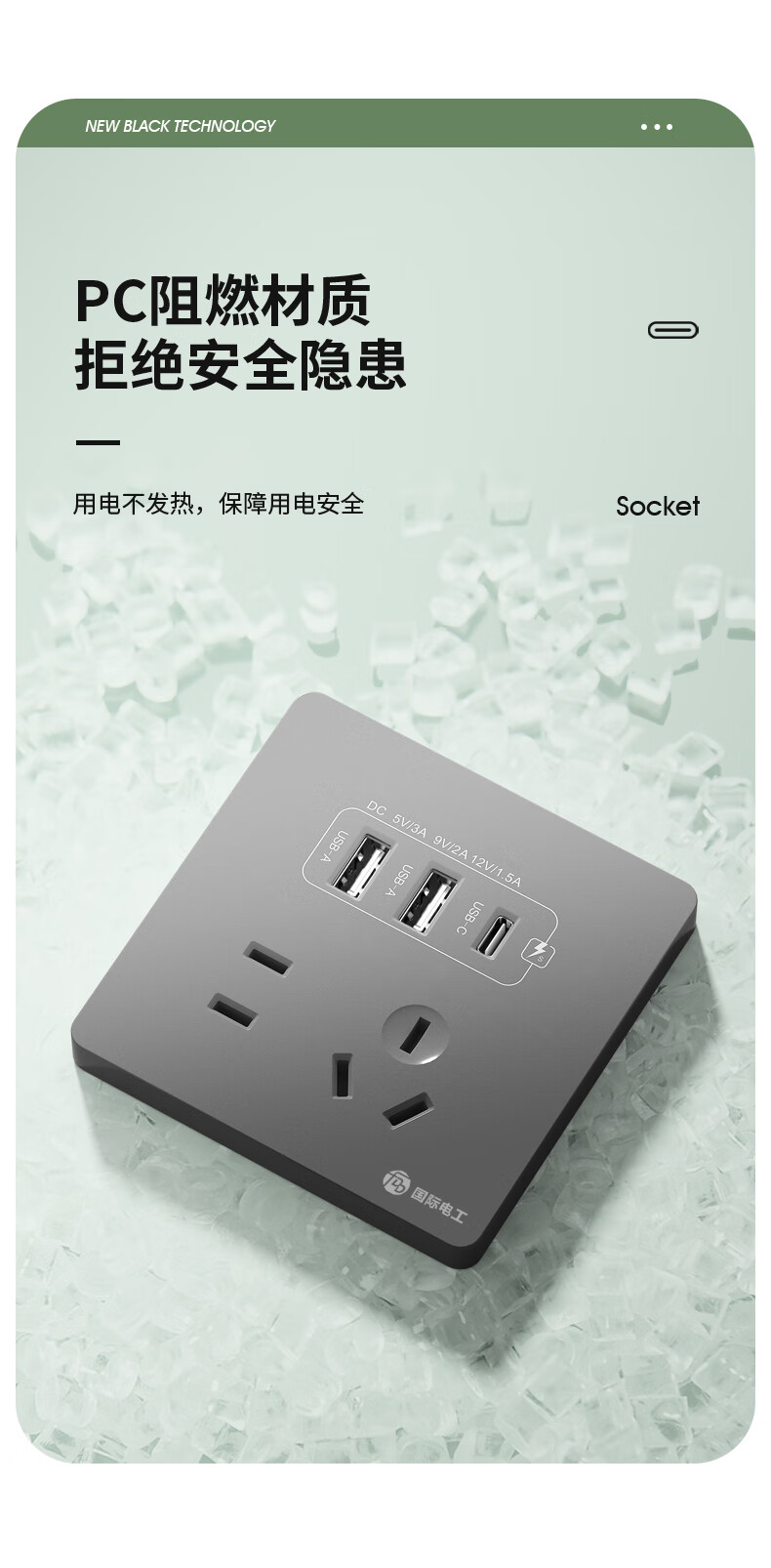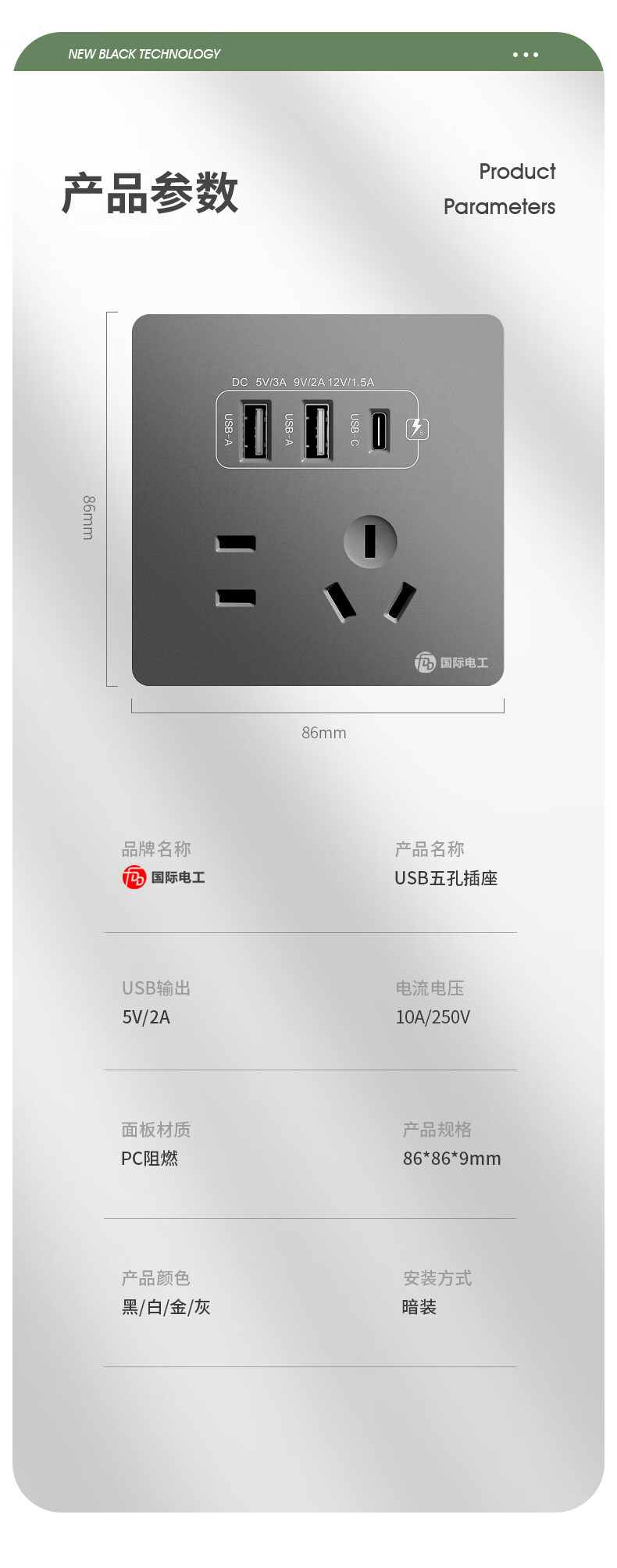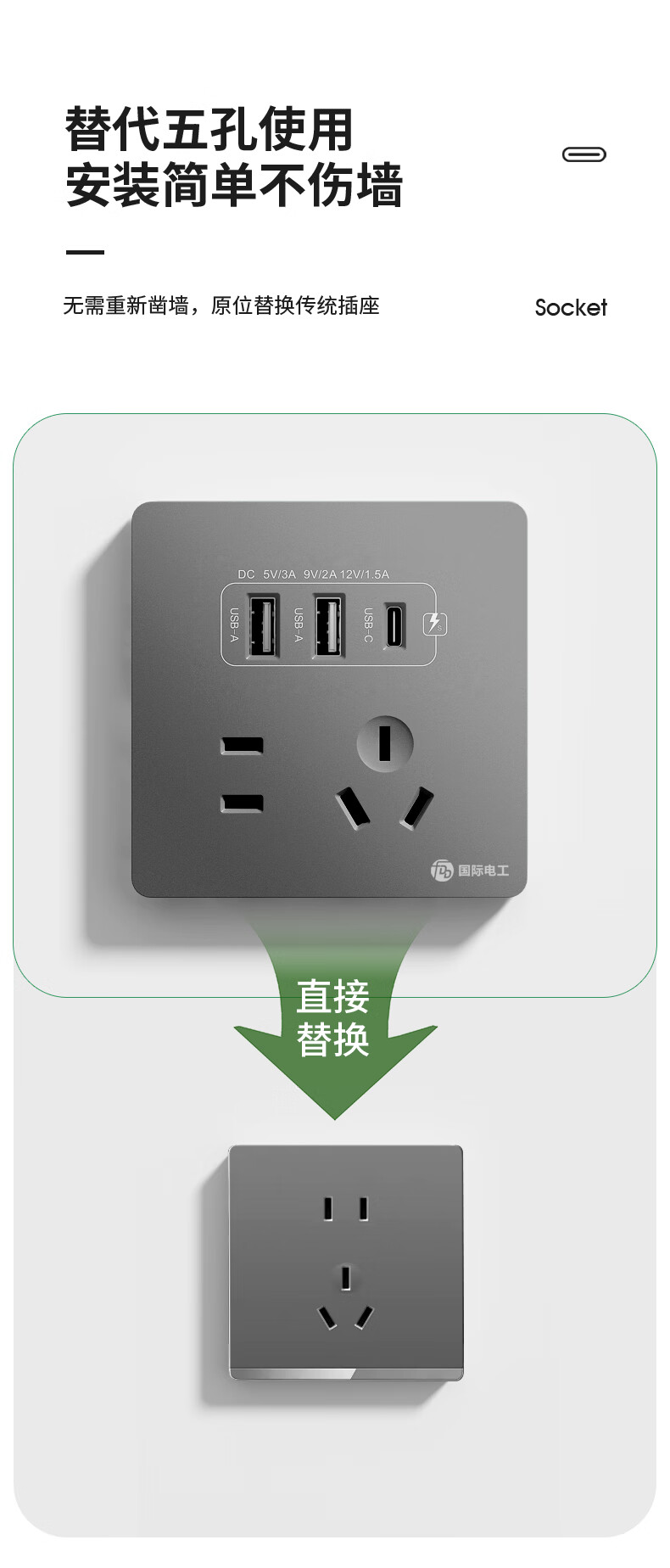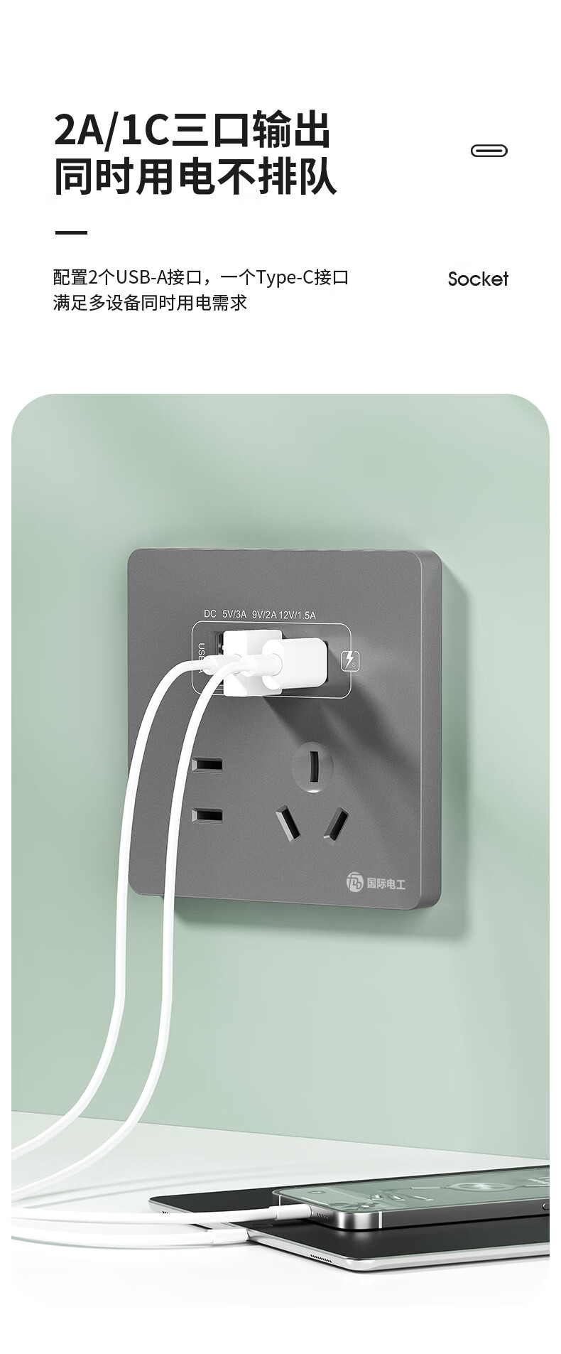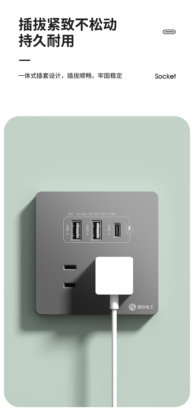 International electrician concealed type 86 20W fast charging USB socket switch panel wall mobile phone charging Type-c household five-hole five-hole 20W fast charging USB+typeC (white)