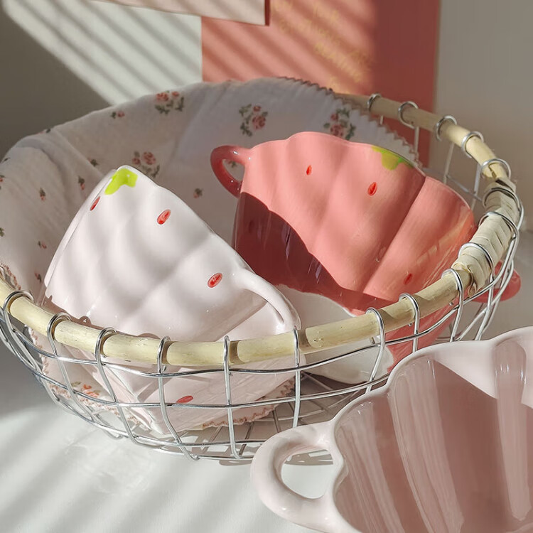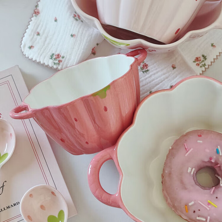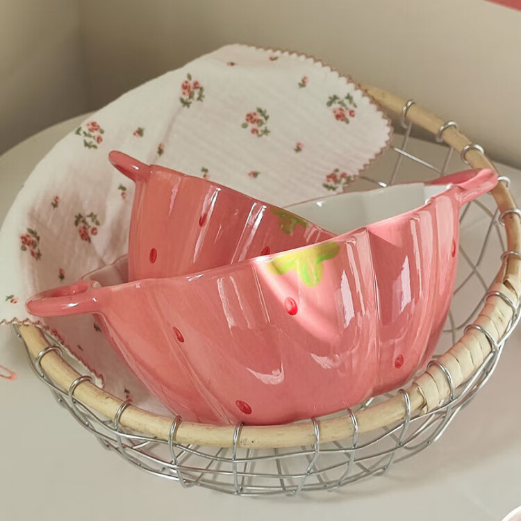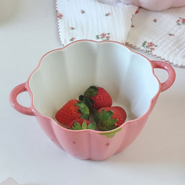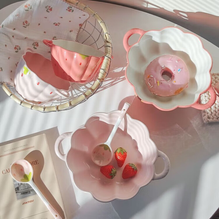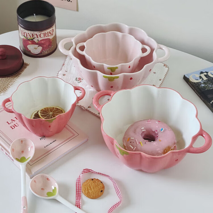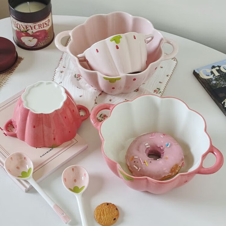 Persson double-ear ceramic bowl with spoon set soup bowl noodle bowl high-looking breakfast bowl Strawberry Duoduo 6-inch bowl with spoon