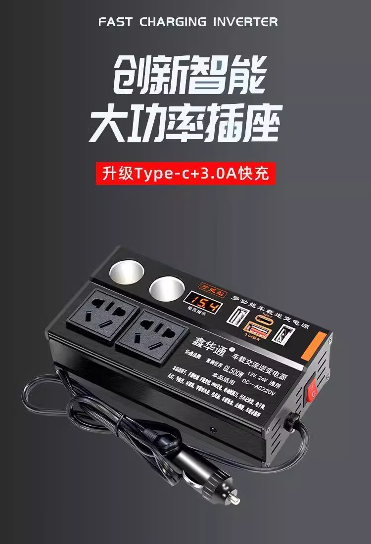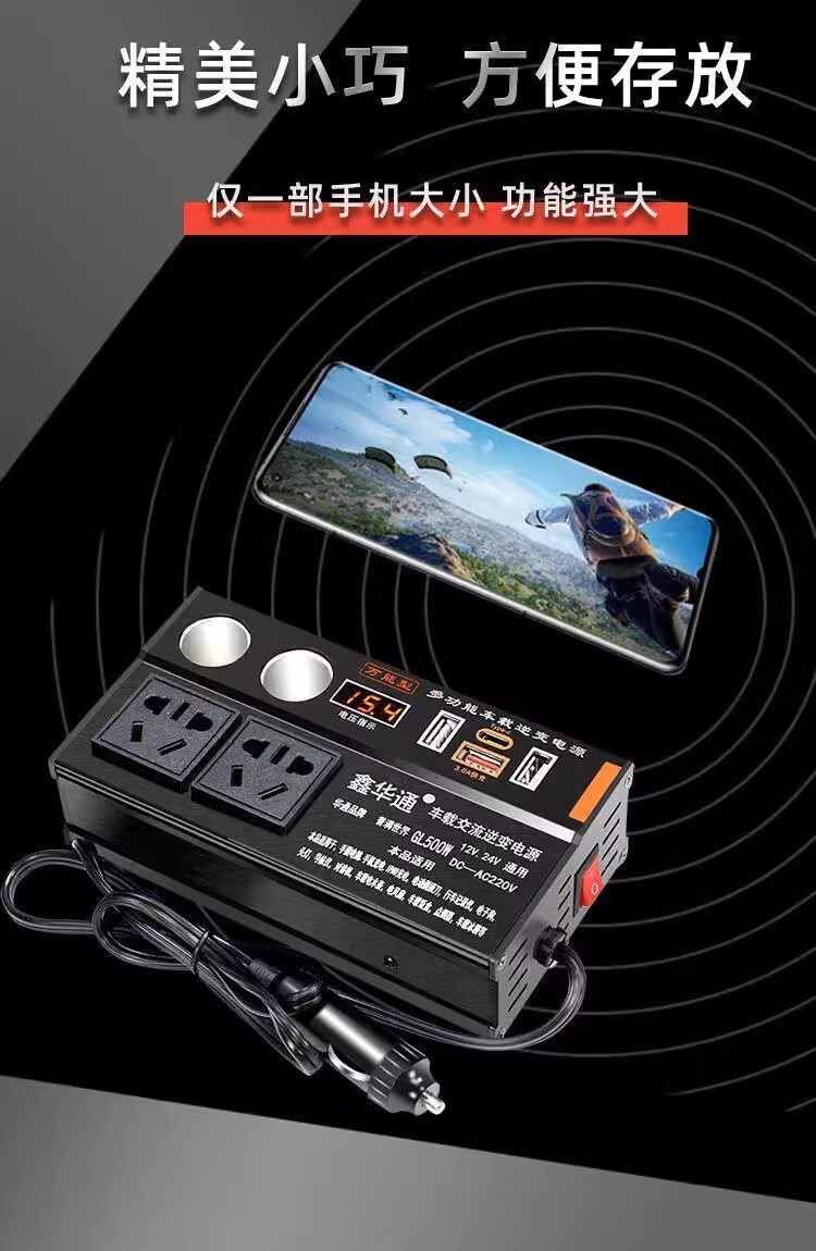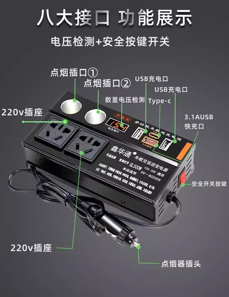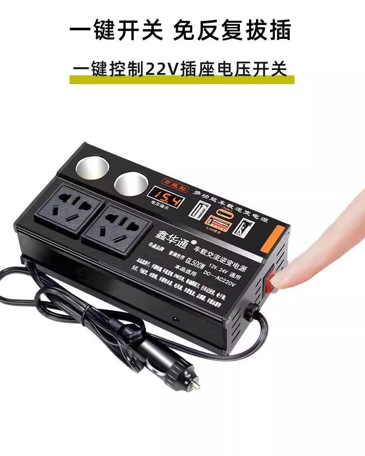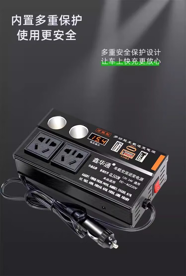 Kylie car inverter 220V power converter 500W/3USB+TypeC+4 sockets+2 cigarette lighters black
