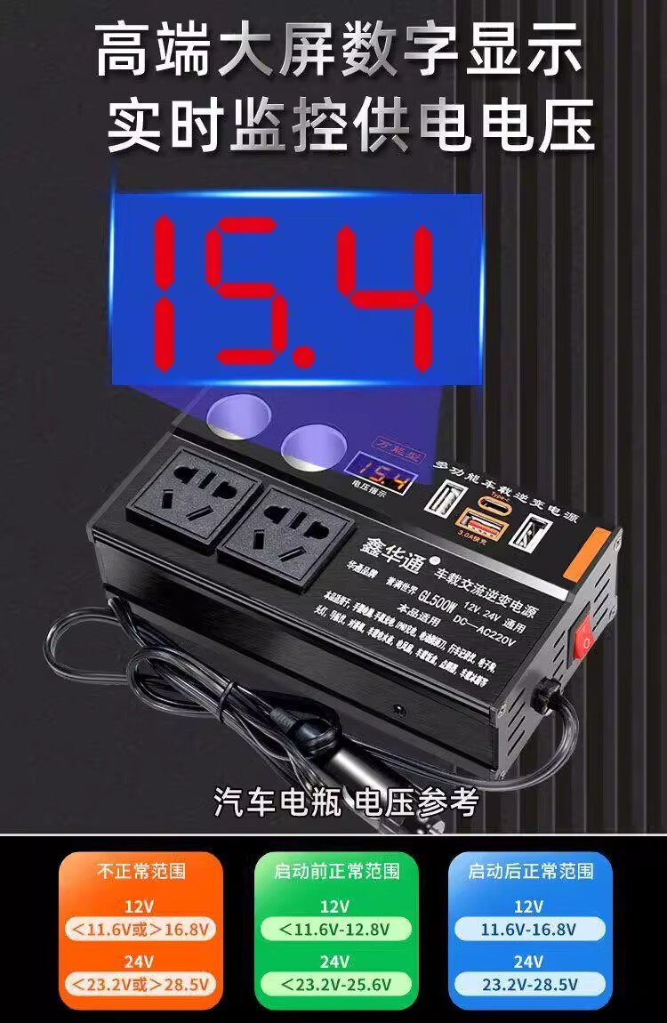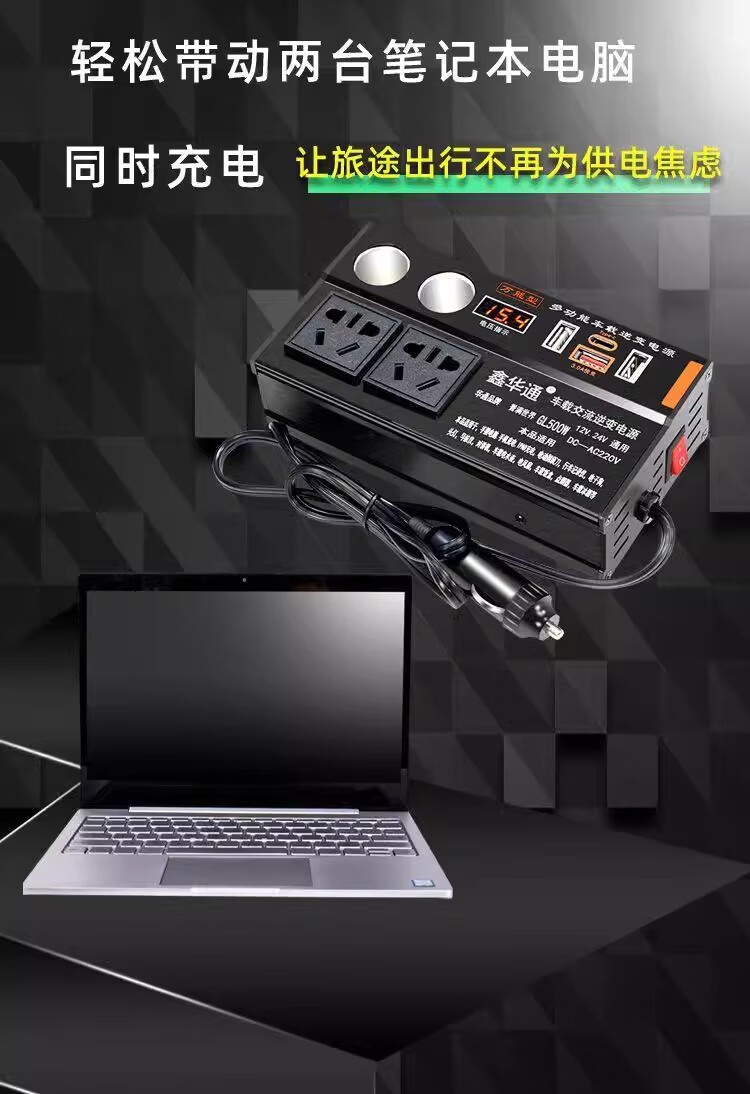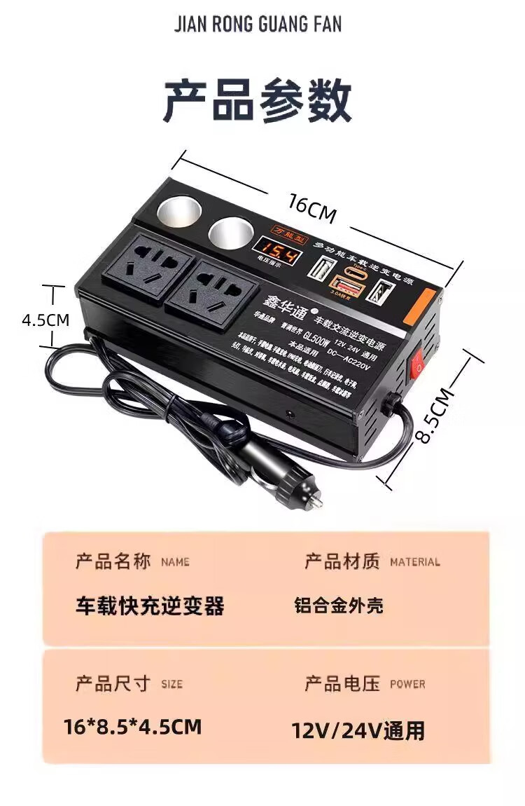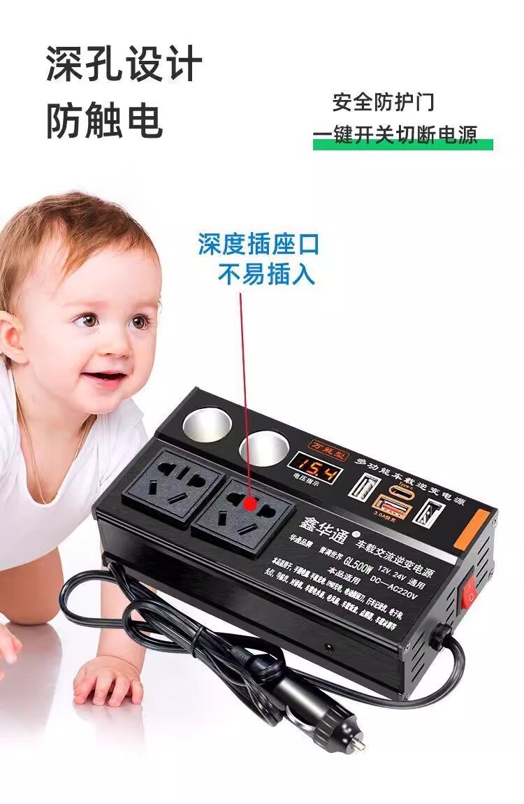 Kylie car inverter 220V power converter 500W/3USB+TypeC+4 sockets+2 cigarette lighters black