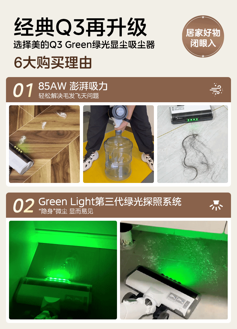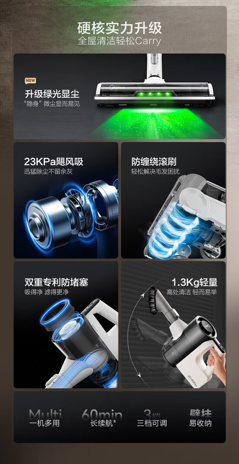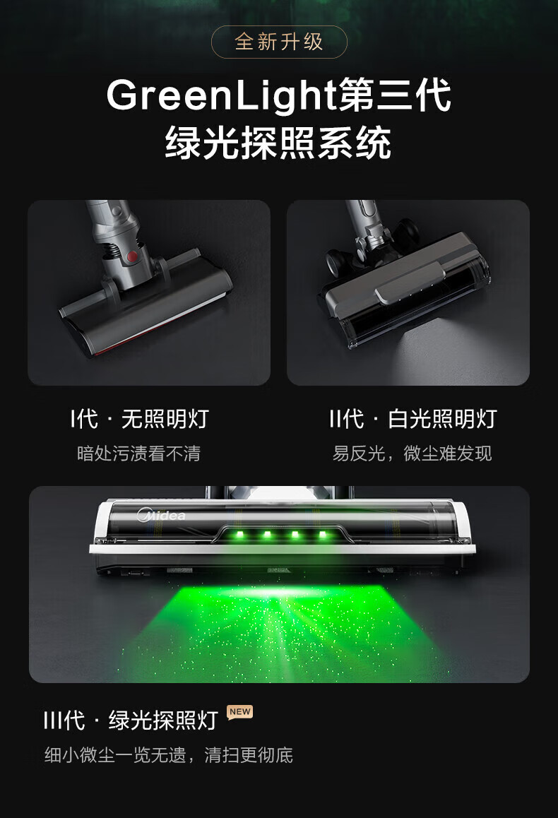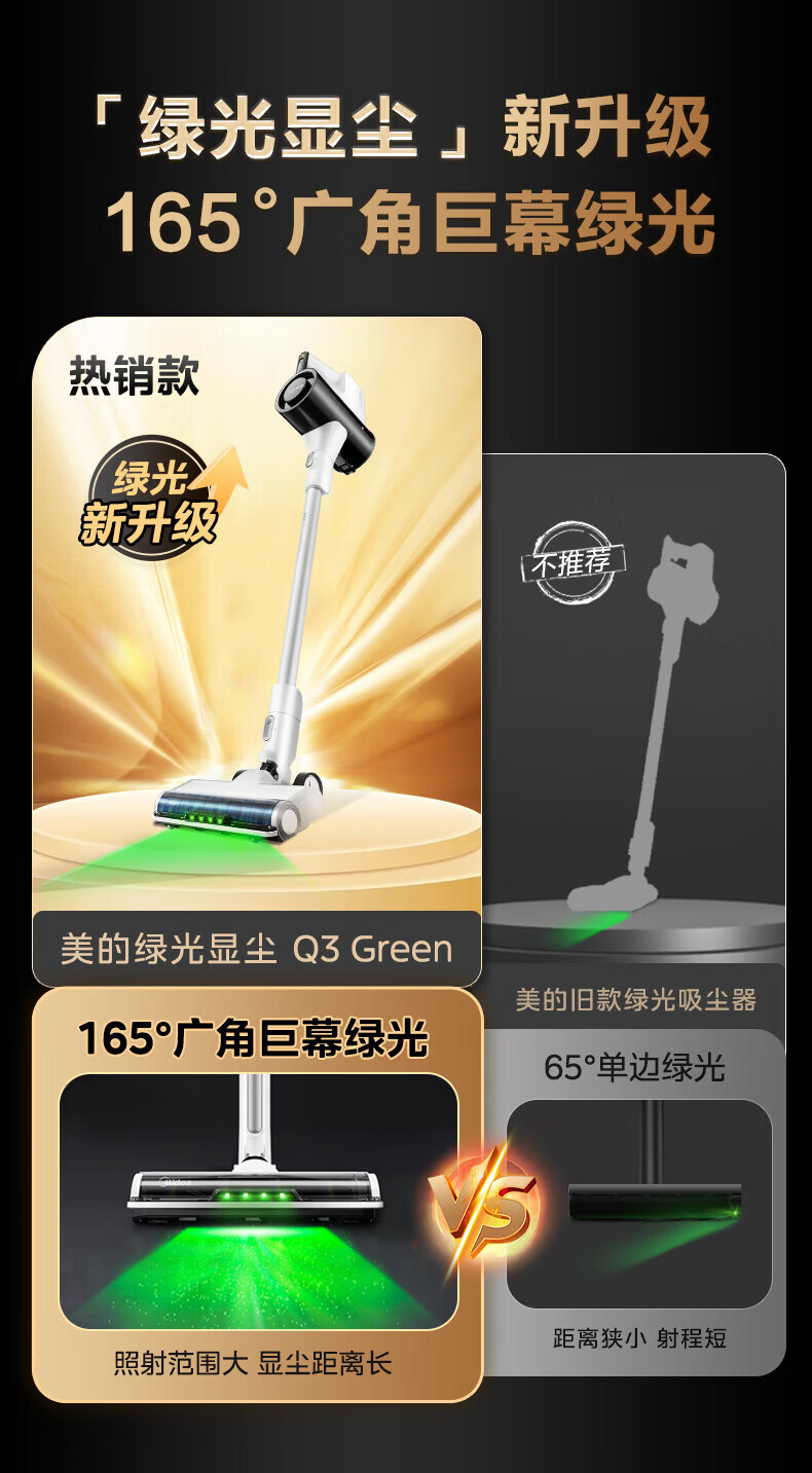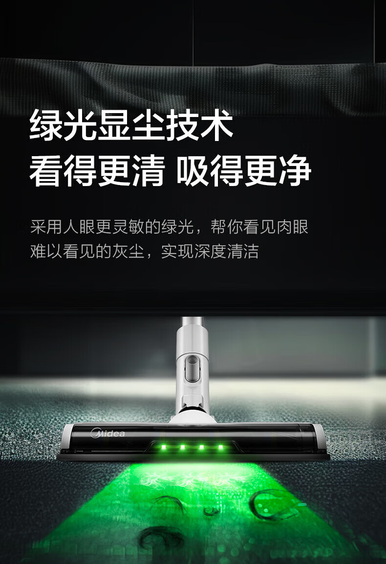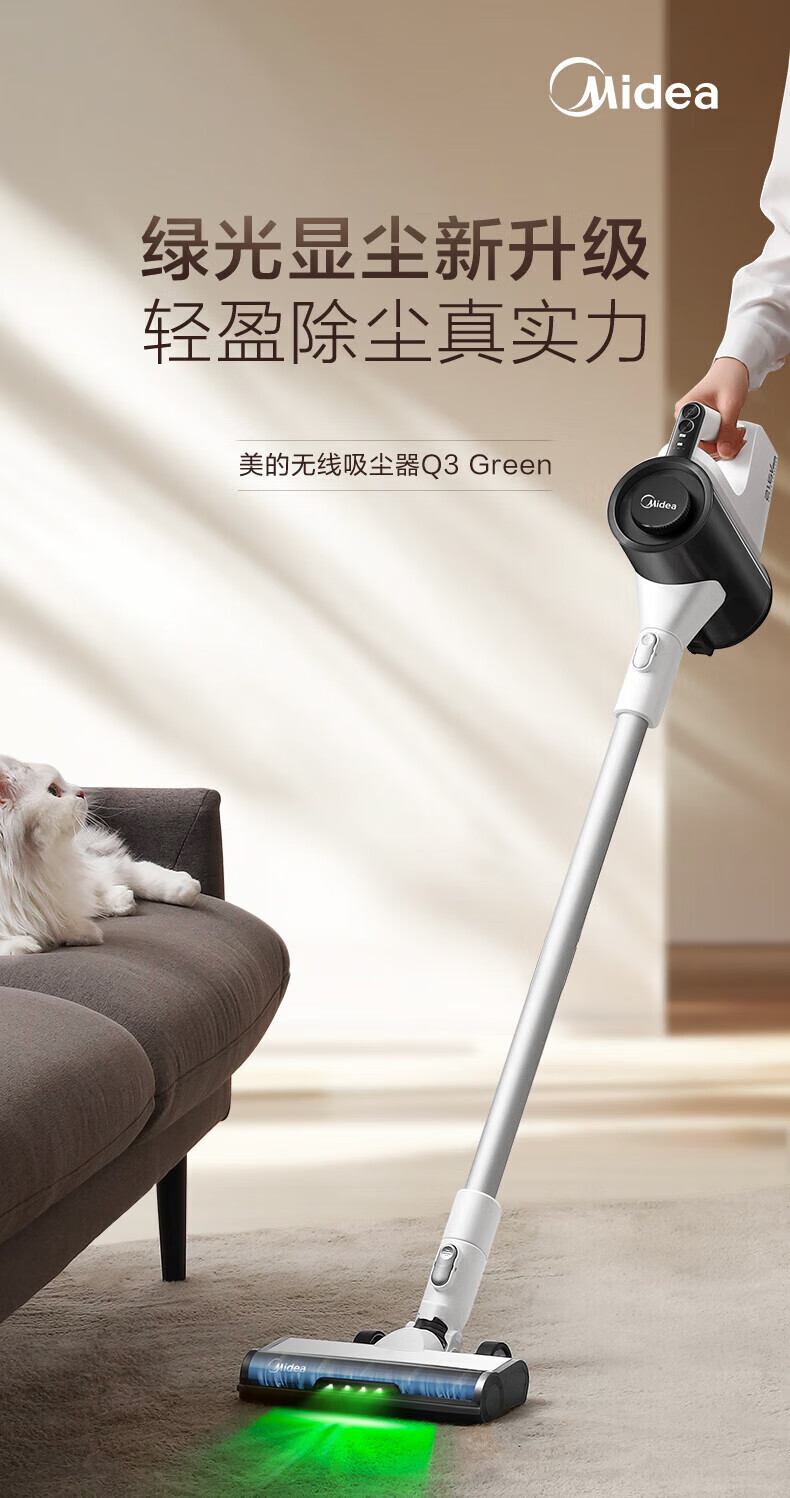 Midea vacuum cleaner household Q3 Green wireless handheld vacuum cleaner high-power super suction green light dust display mite removal dust car-mounted lightweight large suction