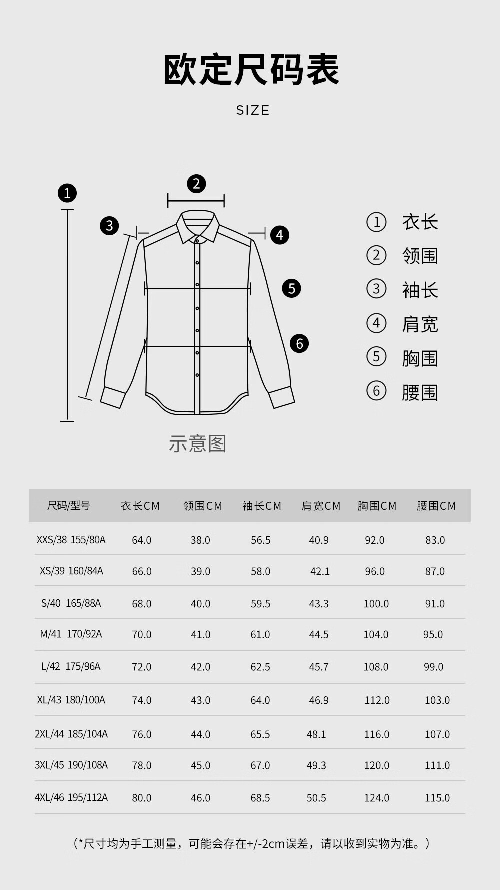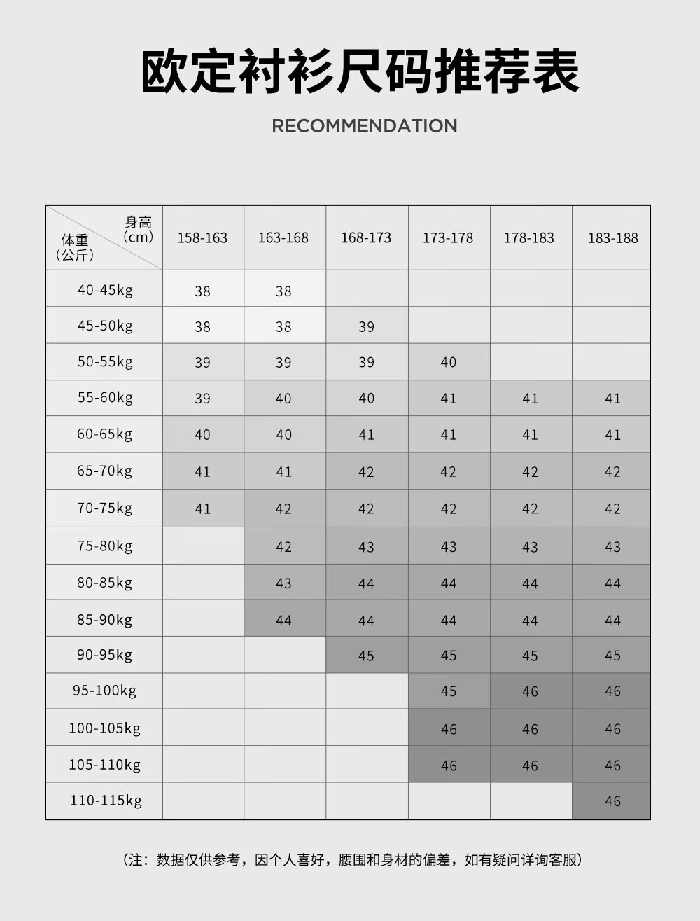 China (cm) 160-165/84-86 165-170 / 88-90 167-172 / 92-96 168-173 / 98-102 170-176 / 106-110
