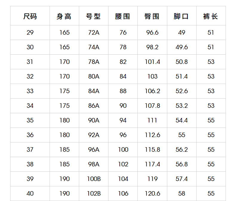 China (cm) 160-165/84-86 165-170 / 88-90 167-172 / 92-96 168-173 / 98-102 170-176 / 106-110
