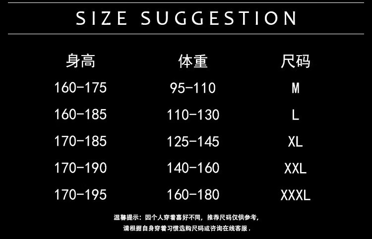 China (cm) 165 / 88-90 170 / 96-98 175 / 108-110 180 / 118-122 185 / 126-130