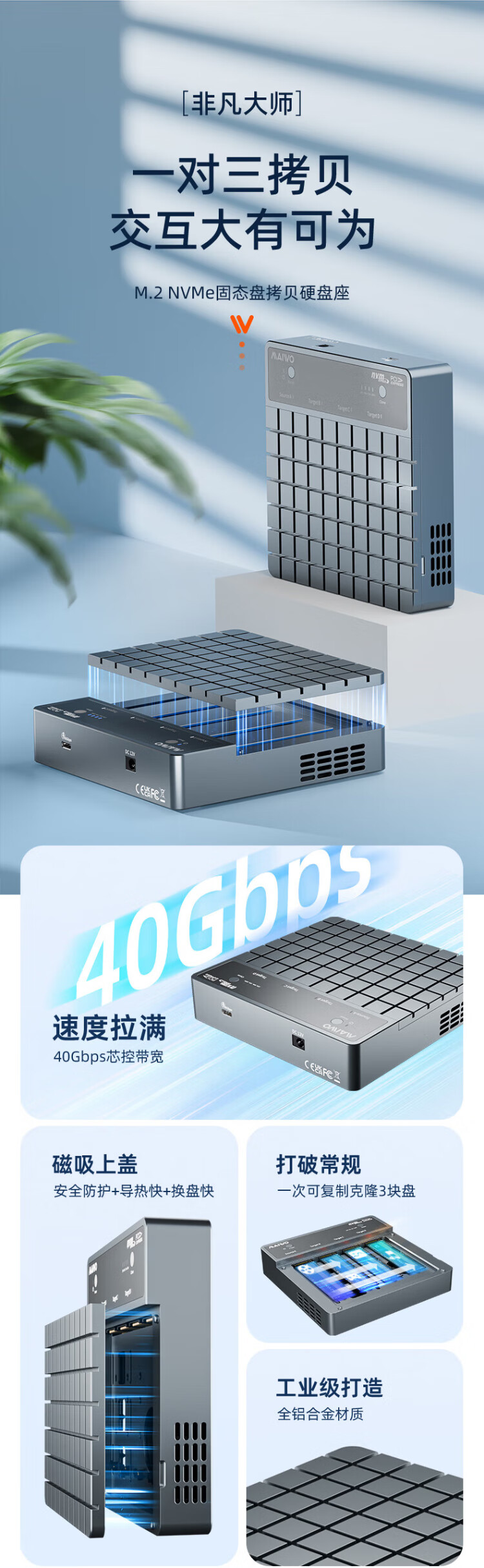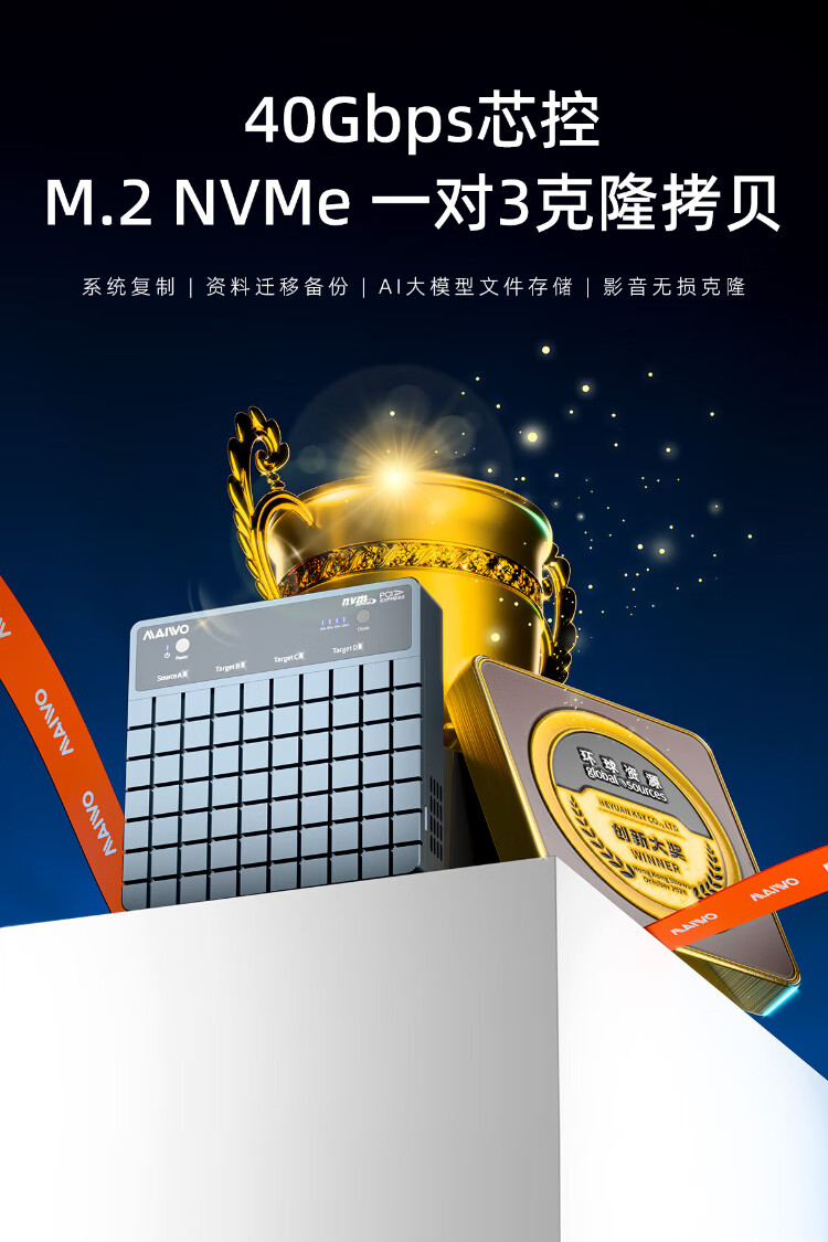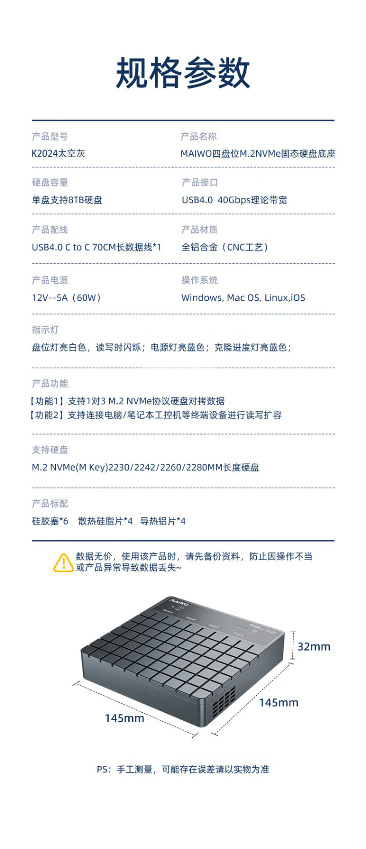 麦沃(MAIWO)USB4.0硬盘拷贝机 40Gbps M.2 NVNe固态硬盘底座 四盘位涡轮风扇笔记本台式电脑硬盘读写盒 K2024