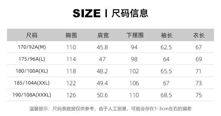 China (cm) 165 / 88-90 170 / 96-98 175 / 108-110 180 / 118-122 185 / 126-130