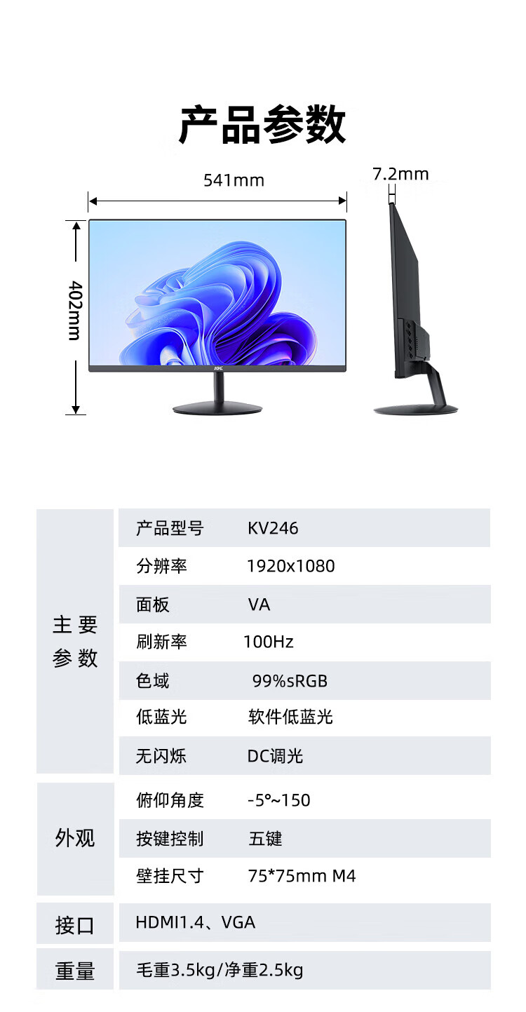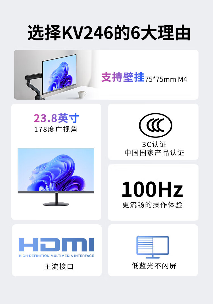KVL 23.8-inch computer monitor 1080P 100Hz low blue light wide color gamut micro-frame slim body desktop computer display state subsidy KV246