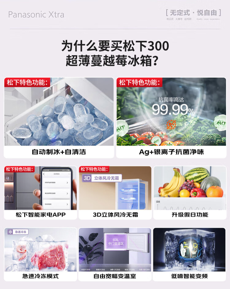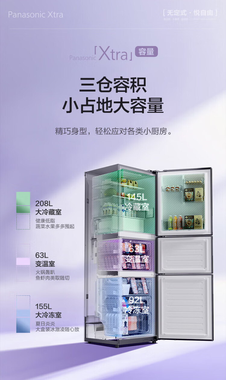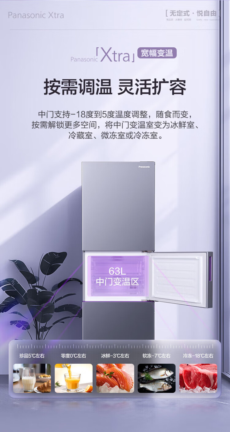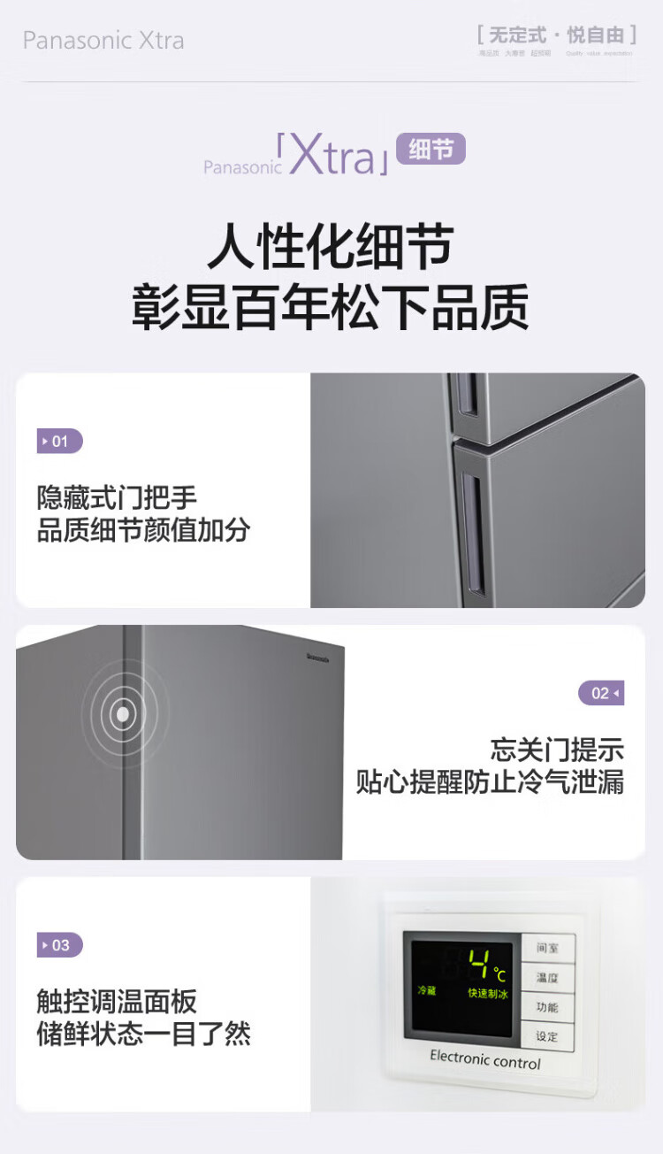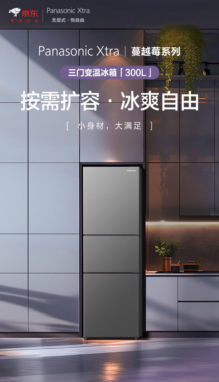 松下(Panasonic)【国家补贴20%】Xtra蔓越莓300升家用小型冰箱三开门超薄无霜自动制冰【一级能效】NR-XC30A2A-S