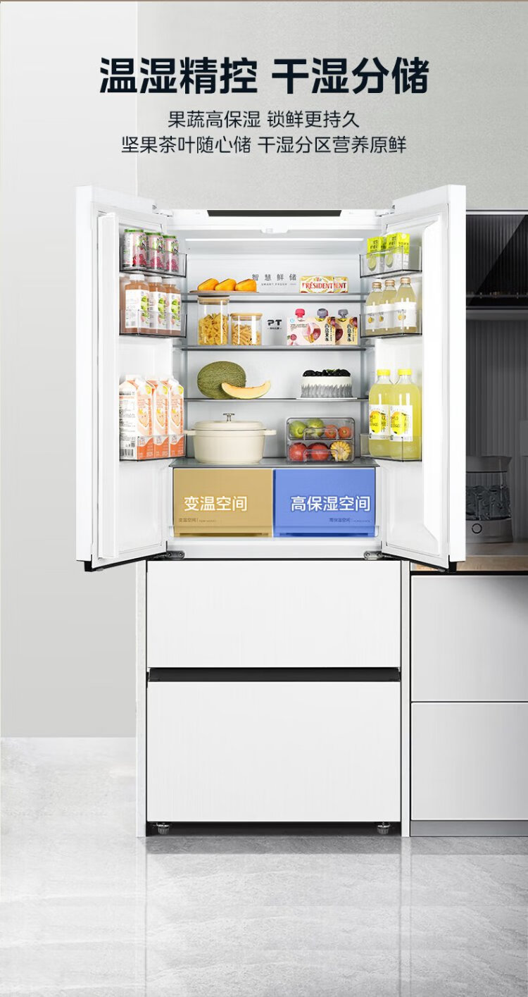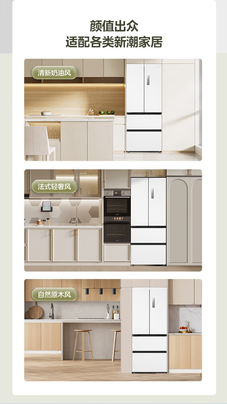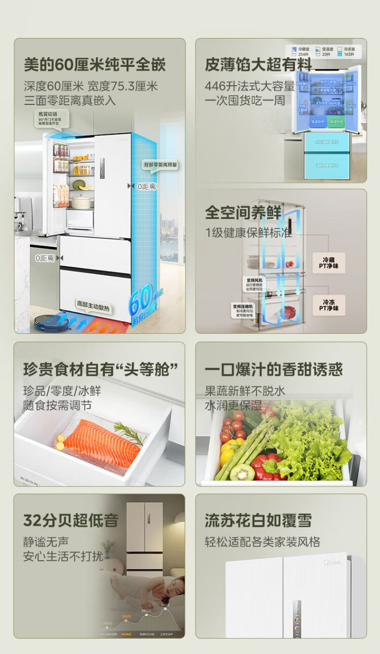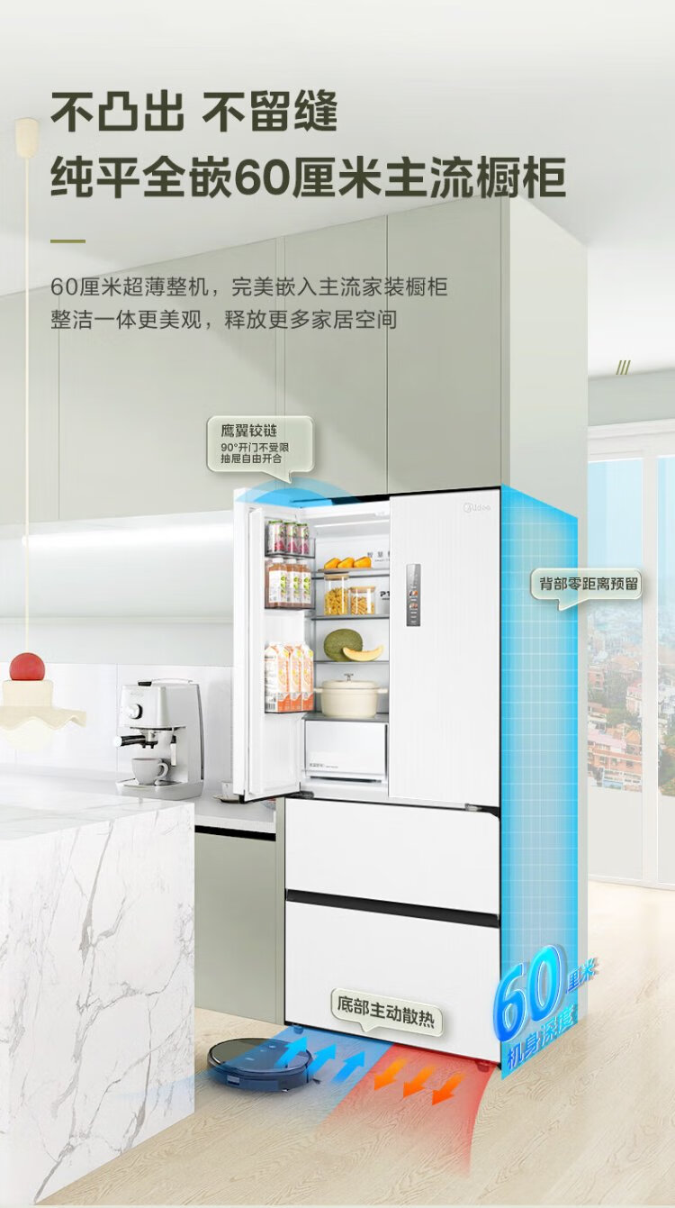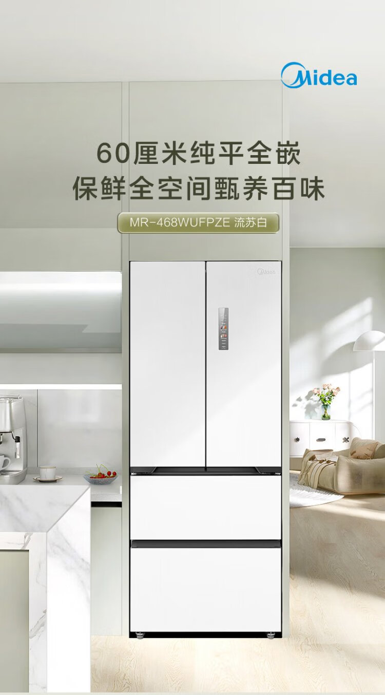 Midea 468 French multi-door four-door ultra-thin flat screen fully embedded bottom cooling first-class energy efficiency frost-free frequency conversion large capacity household refrigerator MR-468WUFPZE 20% national subsidy