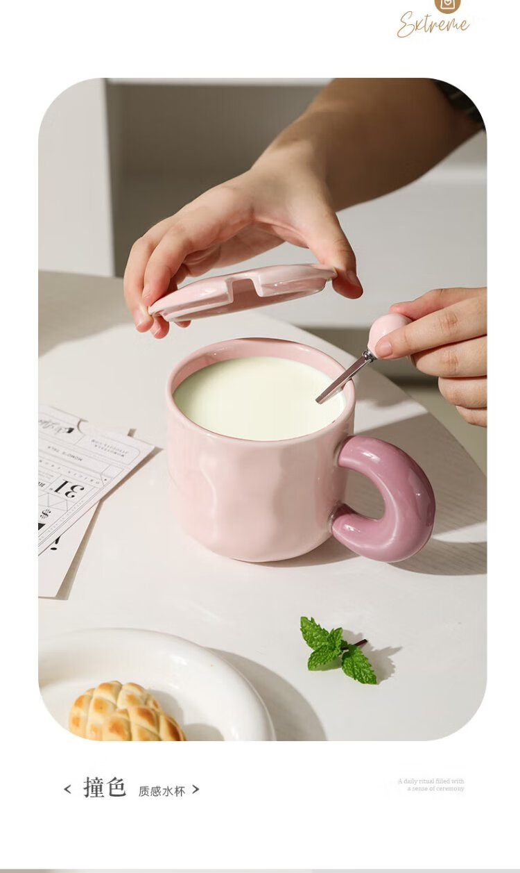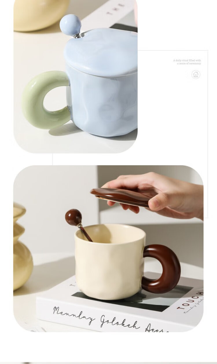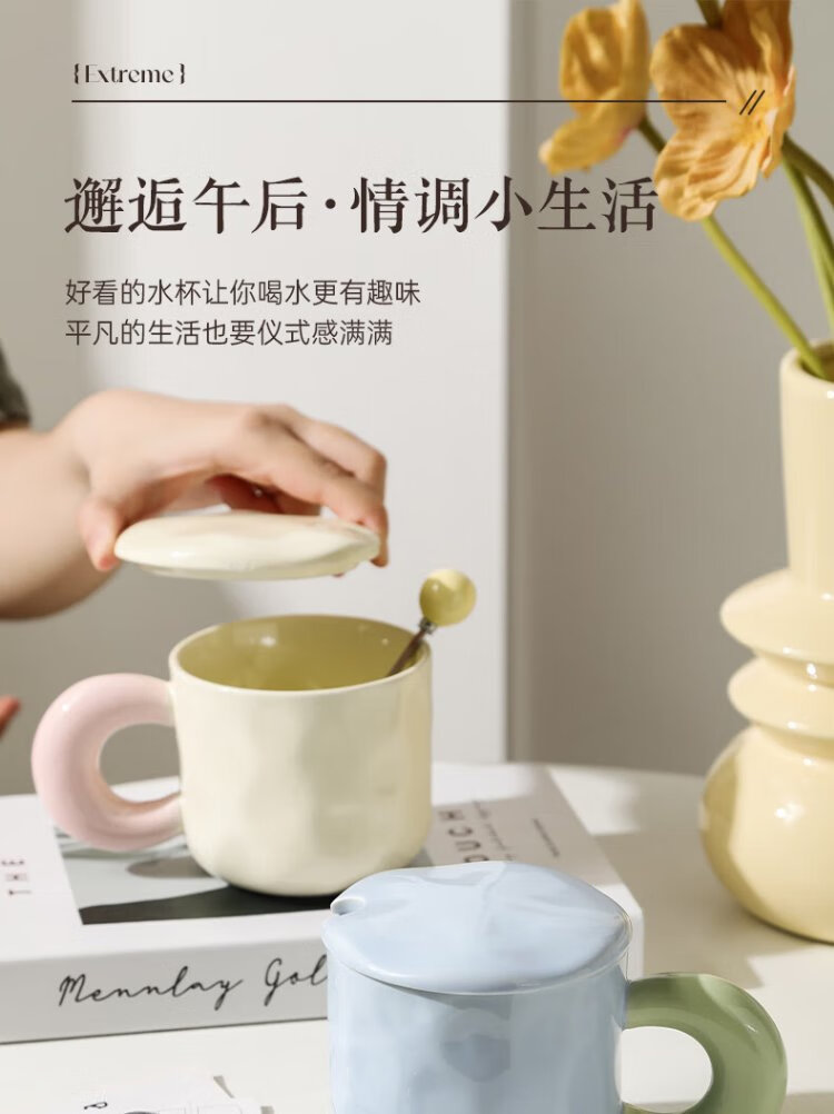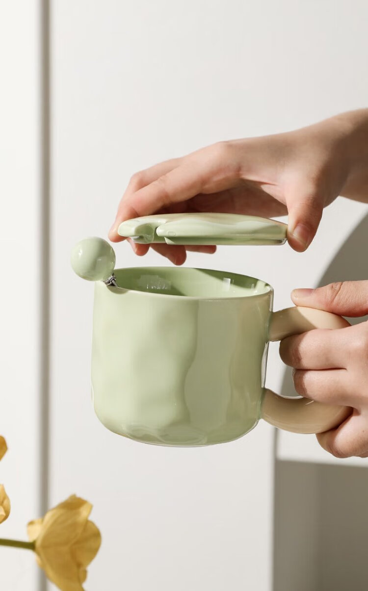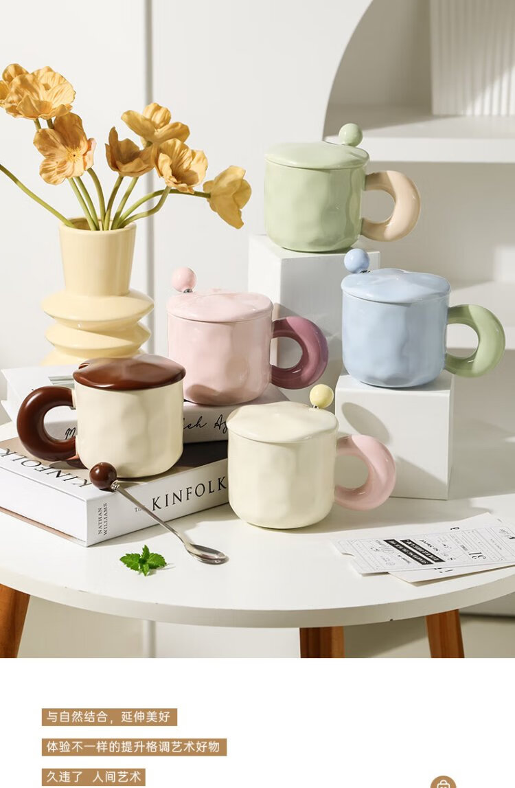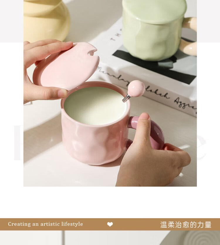 Jiwu Forest Ceramic Mug with Spoon Lid Cup Coffee Cup Couple Tea Cup Men and Women Large Capacity Yellow 420ml