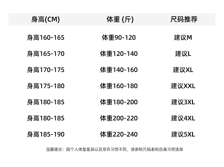 China (cm) 165 / 88-90 170 / 96-98 175 / 108-110 180 / 118-122 185 / 126-130