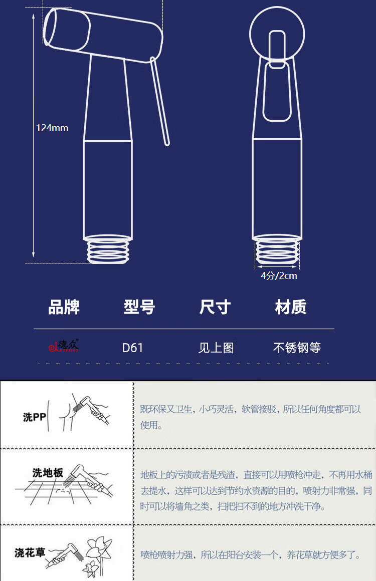 Dezhong spray gun high pressure water spray gun flushing water gun D61 304 stainless steel
